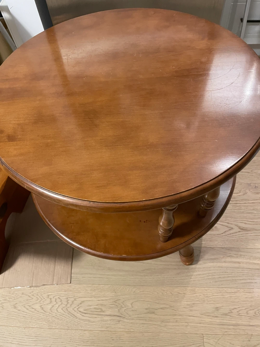 A lovely round wooden side table, perfect for adding a touch of warmth to any room! It features a classic design with a smooth, round top and a convenient lower shelf. The table is in good condition and ready to find a new home! 22 inches diameter 26 inches height Cash only