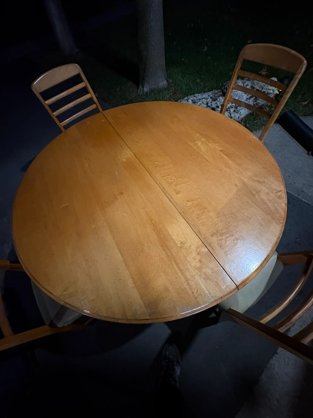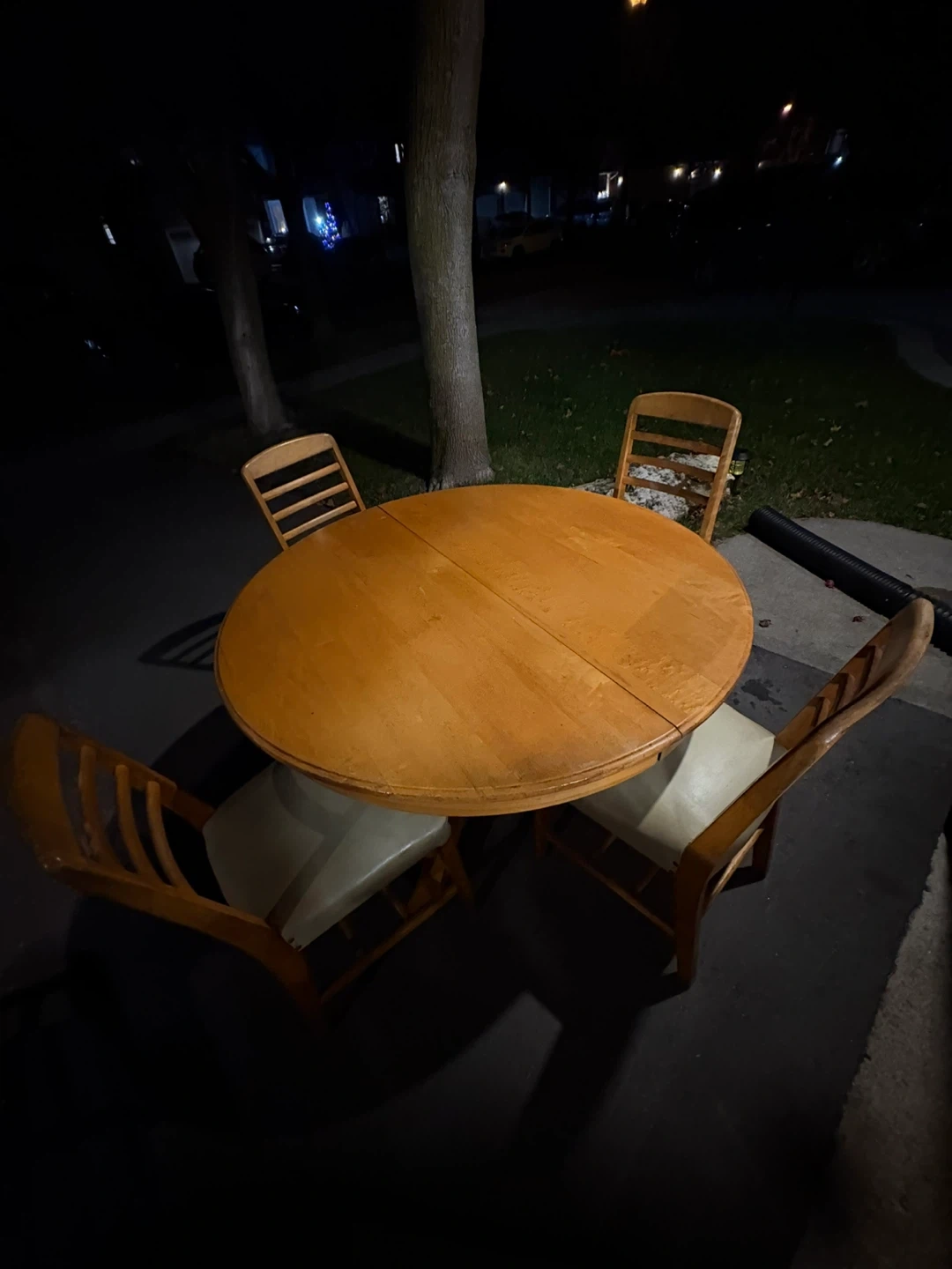 110Selling a round wooden table with four matching chairs. It's a great set for a smaller dining area or kitchen nook. The chairs have a light-coloured seat, and the table has a warm wood tone. Perfect for family dinners or game nights!