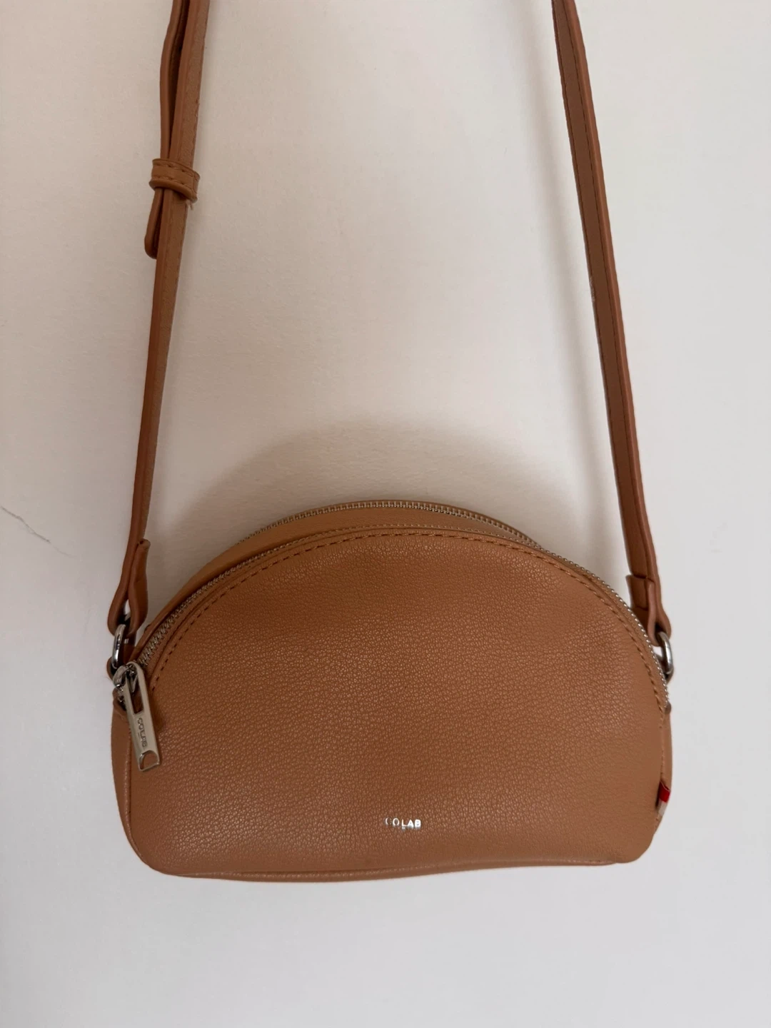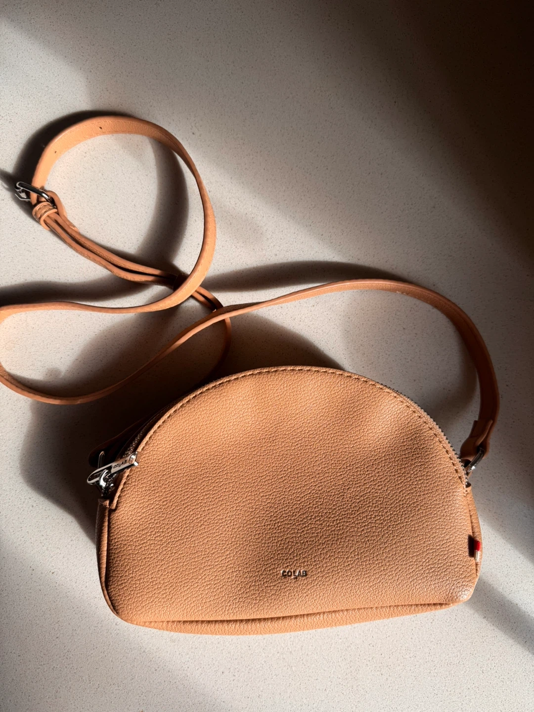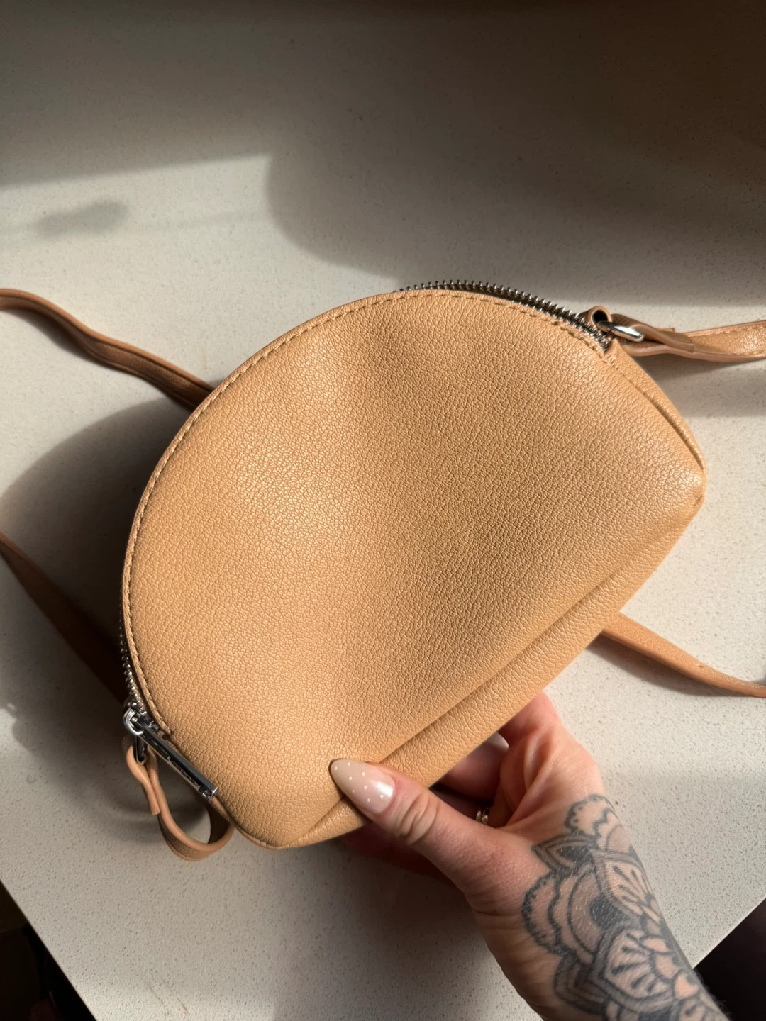 This is a tan faux leather half moon crossbody bag from Colab. It has a zip closure and an adjustable strap. Interior lining is a pale green. Small mark on the inside that needs to be cleaned and little scratch that’s not noticeable on the back