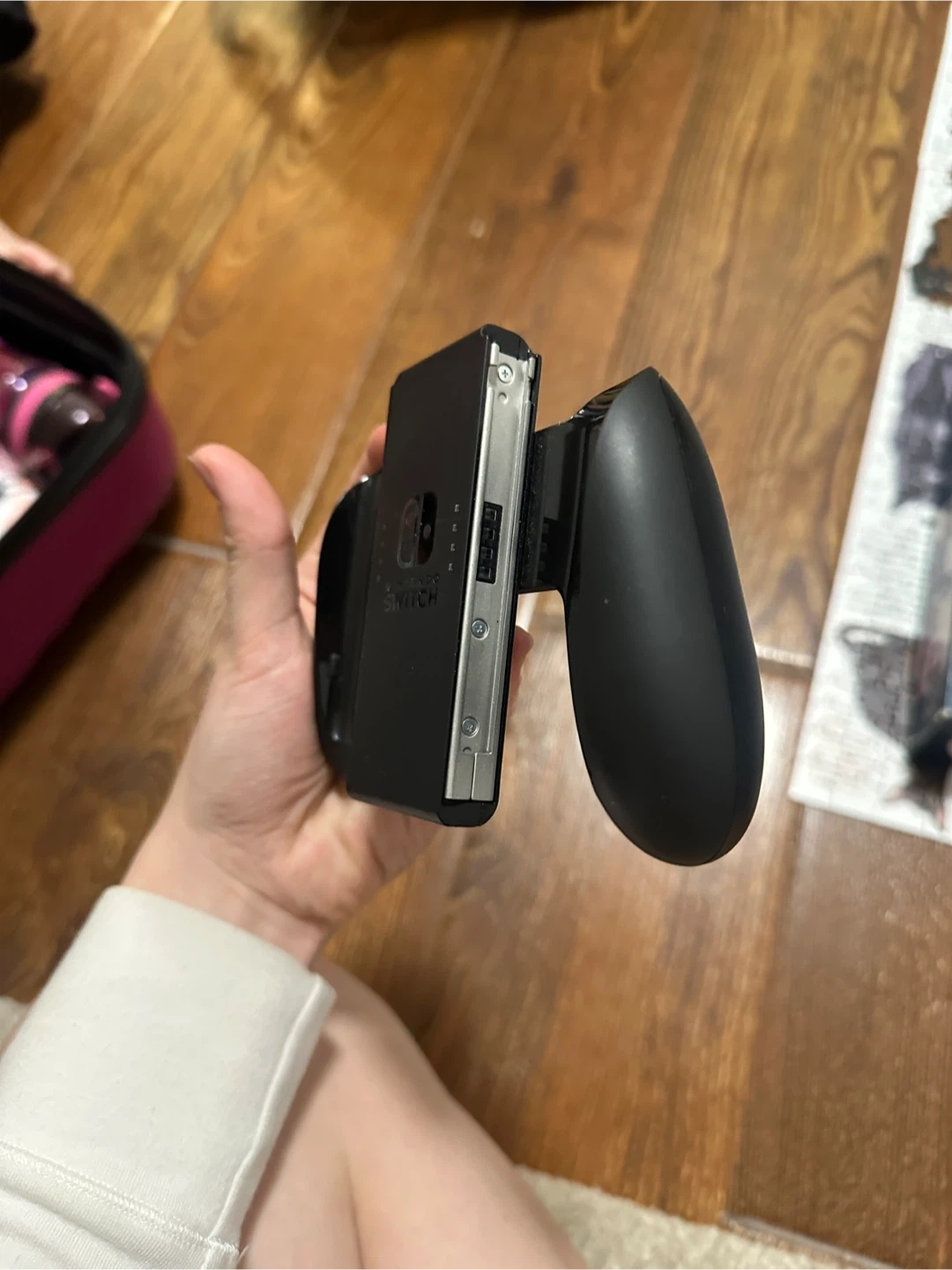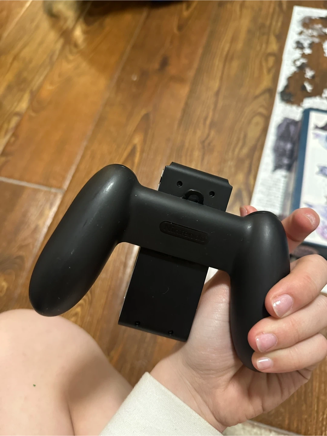 This is a Nintendo Switch Joy-Con charging grip. It allows you to charge your Joy-Con controllers while you play. It's black and made of plastic. This accessory is useful for extended gaming sessions.