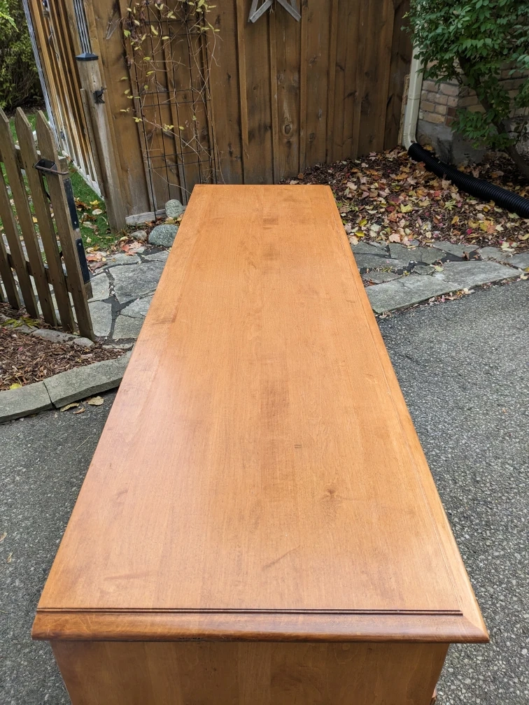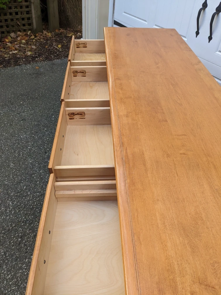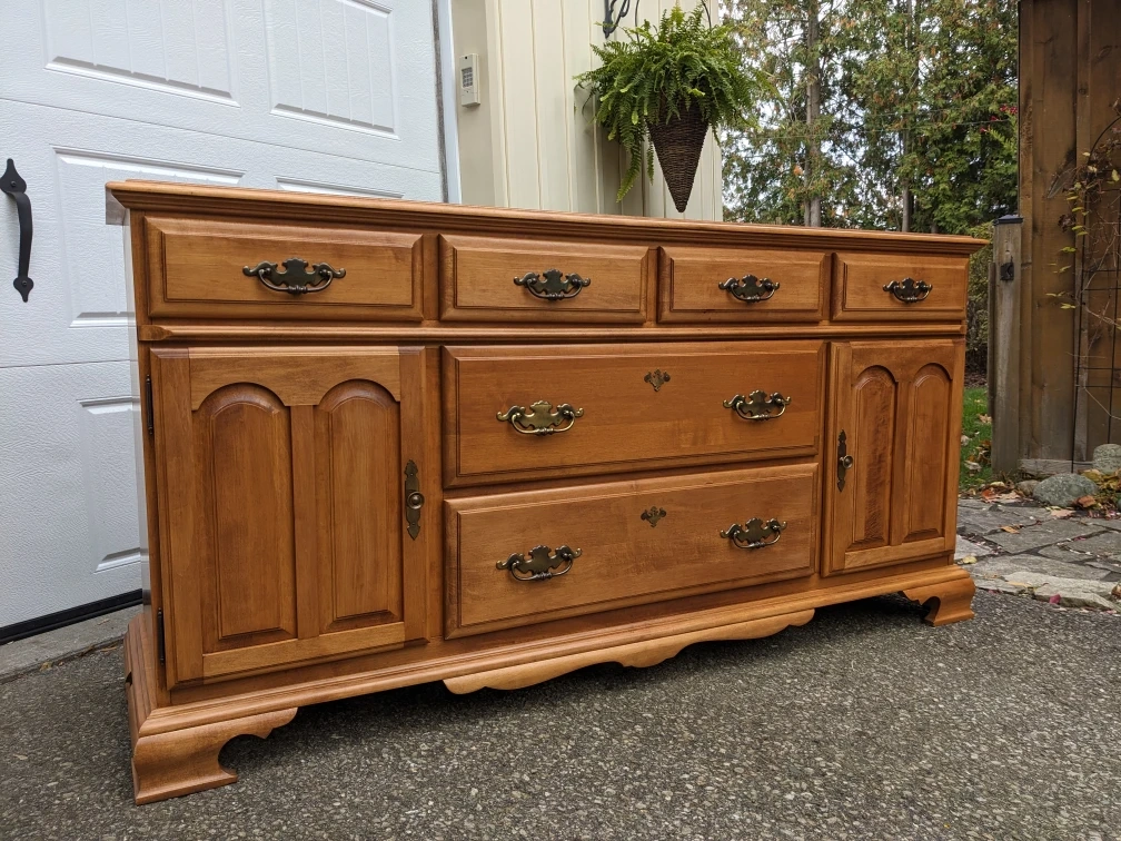 90Manufactured by premium Canadian furniture makers, Roxton; this dresser/cabinet combo features quality solid maple construction. This large dresser has 8 drawers and a cabinet with a shelf for additional storage. This is a solid and sturdy piece that is built to last for decades. The drawer all function as they should and the interiors are in excellent condition. This can also function as a sideboard buffet or credenza. There are some surface scratches on the top from normal use, but is in overall excellent condition. Measures: 66"W x 19" D x 33"H Curbside delivery is available for an additional fee, depending on location. The delivery fee must be prepaid; the remaining balance is due upon delivery.