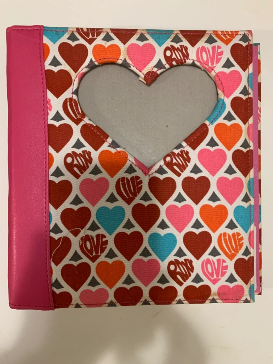 101Here's a cute Roxy photo album! It features a colourful heart pattern on the cover with a heart-shaped cutout for a picture. Inside, there are plastic sleeves to hold your precious memories. The album is in great condition and ready for a new home