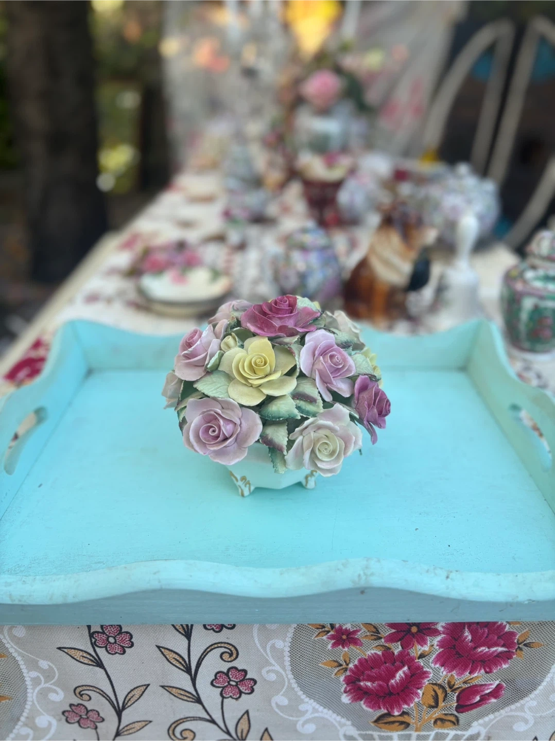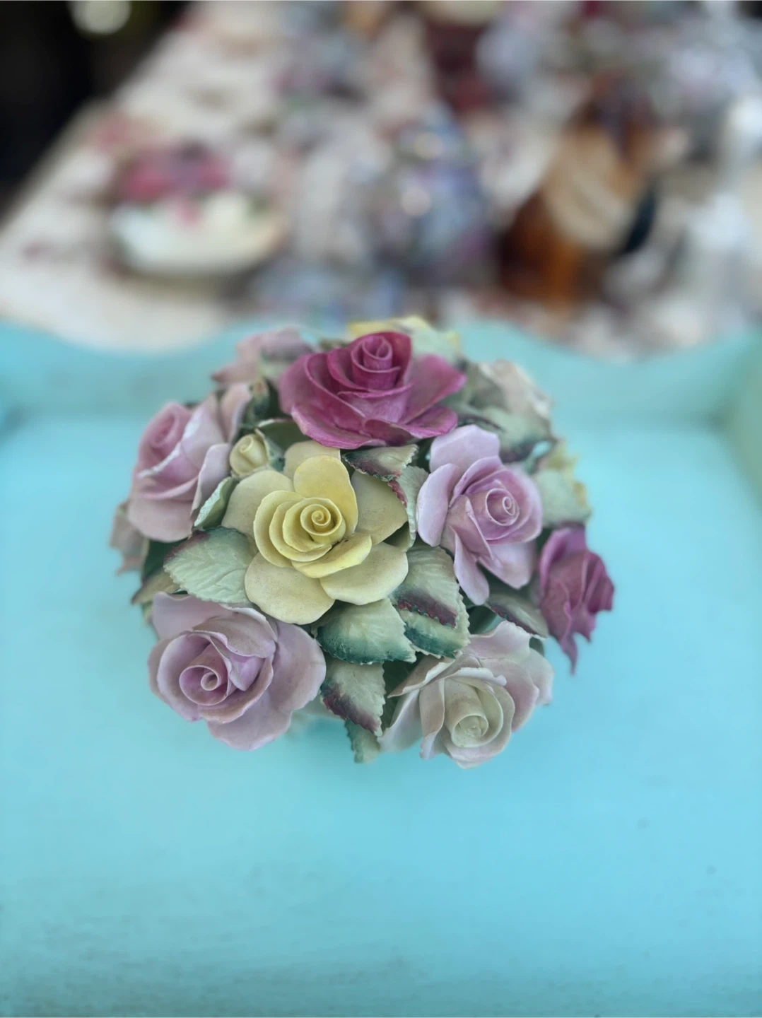 This is a beautiful Royal Adderley floral arrangement! It features delicate porcelain roses in shades of pink, purple, and yellow, all nestled together with green leaves. It's in great condition and would make a lovely addition to any room