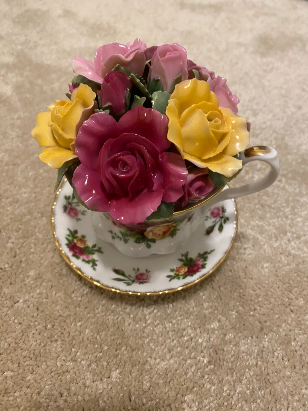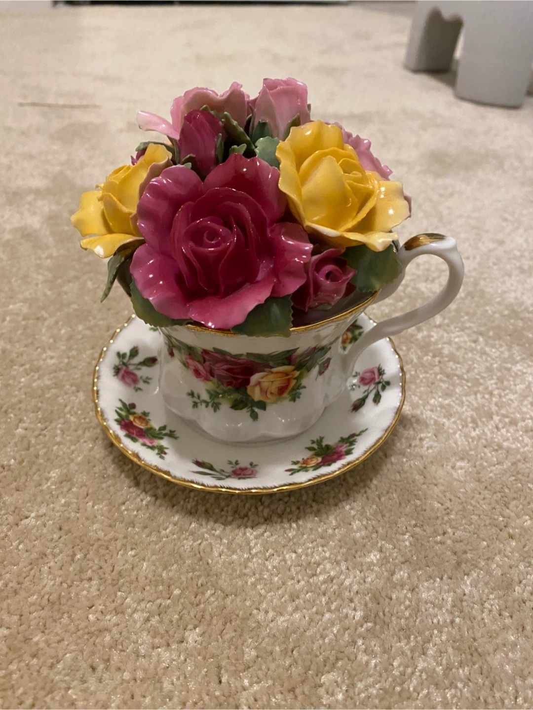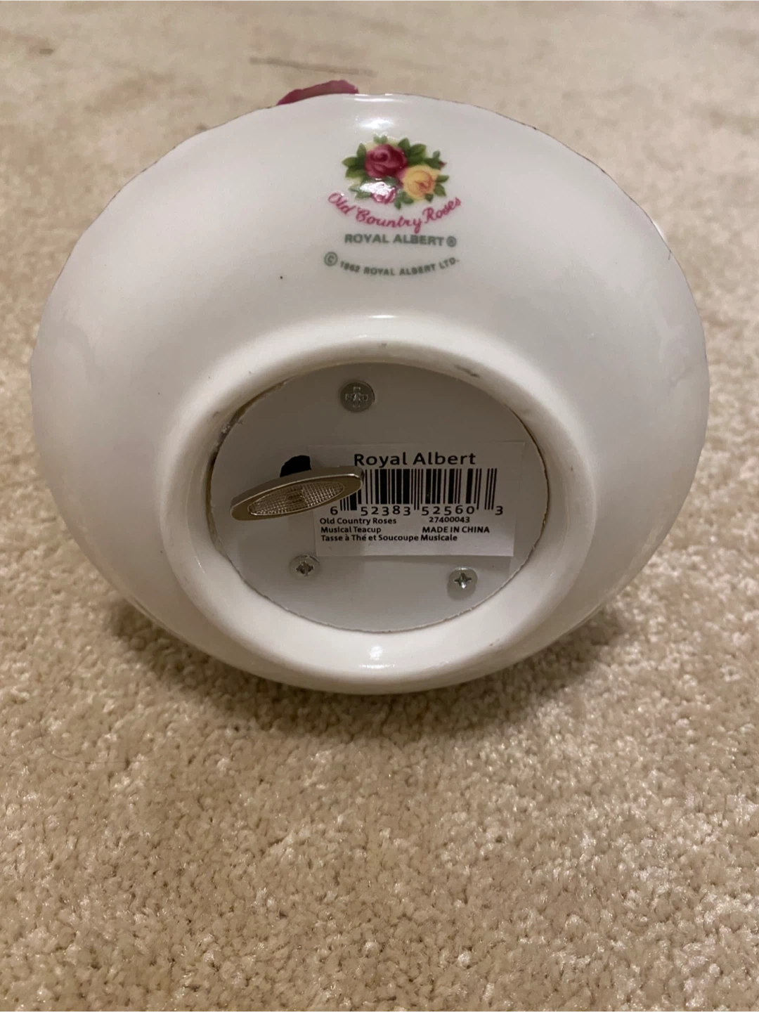 11Selling a charming Royal Albert Old Country Roses musical figurine! It's shaped like a teacup and saucer filled with beautiful roses. A lovely addition to any collection or as a sweet decorative piece