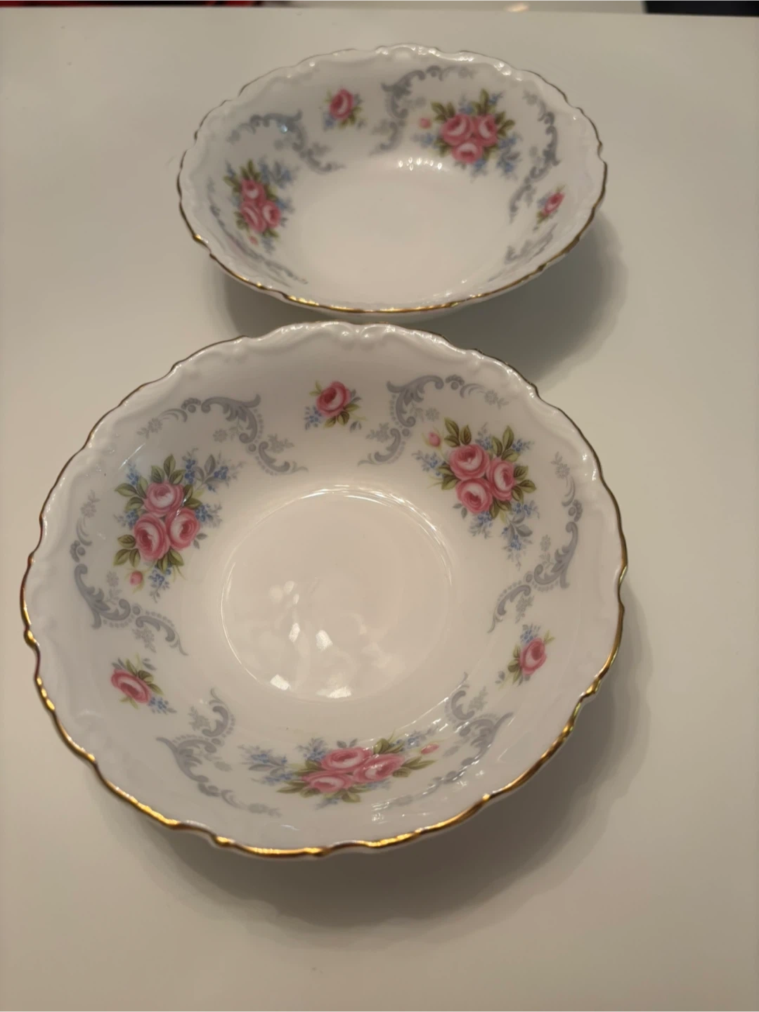 480Selling a set of Royal Albert Tranquility bone china bowls. They feature a beautiful floral design with pink roses and a delicate gold trim. Perfect for adding a touch of elegance to your table!