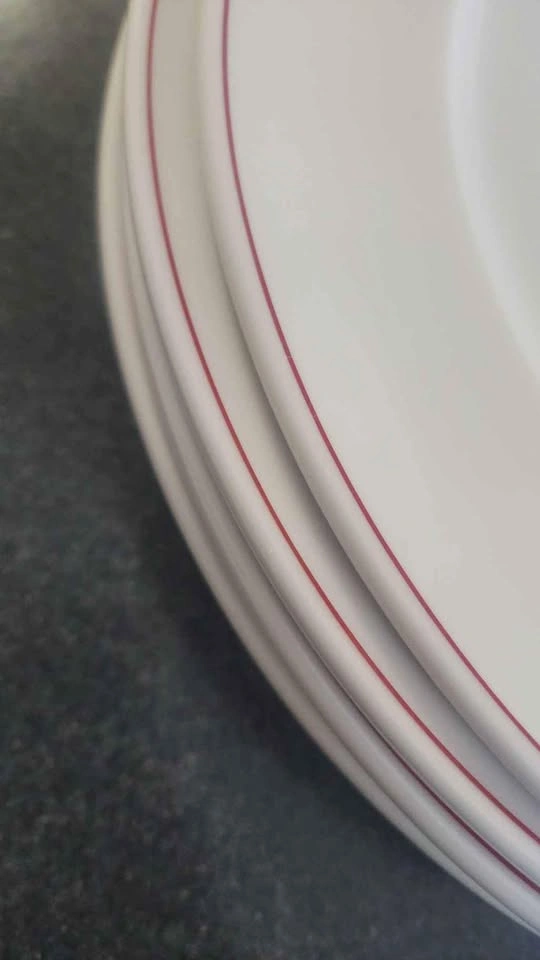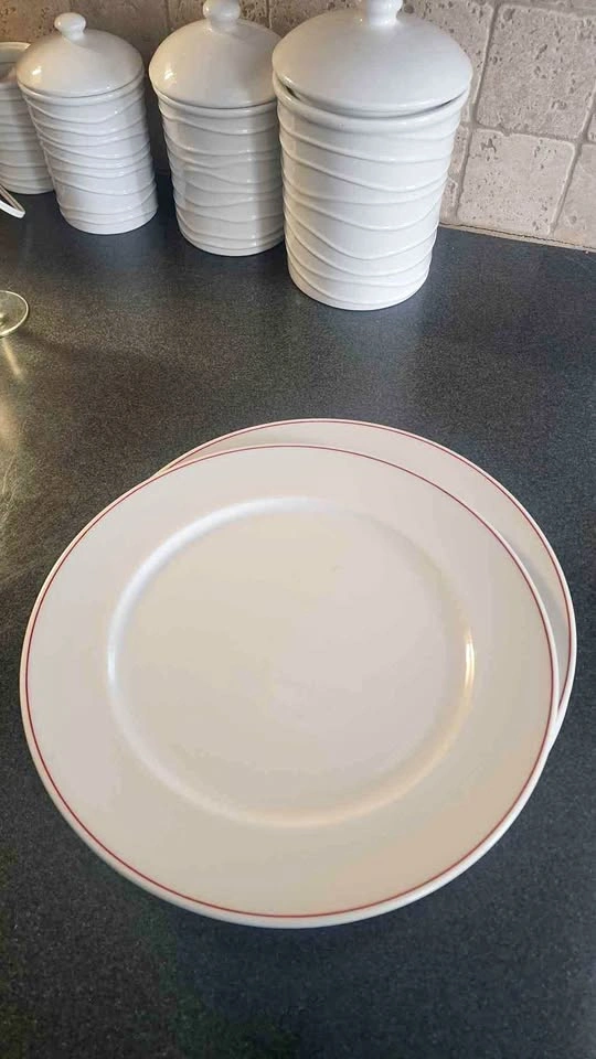 Set of 6 Royal Doulton large dinner plates. White with red piping. 12" diametre. New and never used. Pick up in North Oshawa. Cash only.