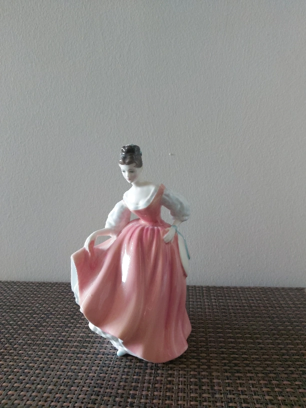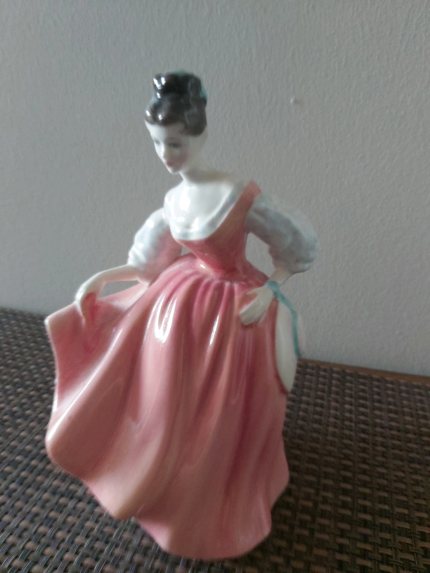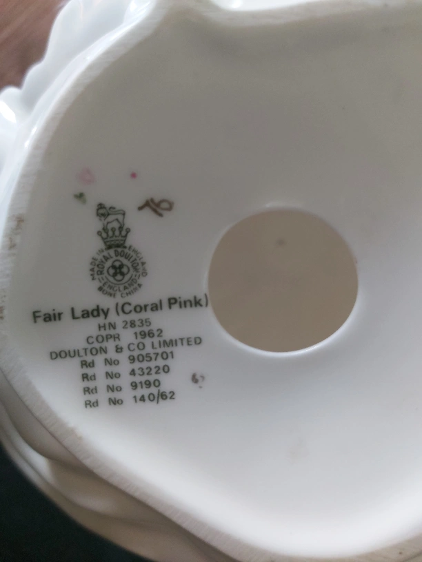 Royal Doulton figurine of a Fair Lady in Coral Pink. The figurine is marked HN 2835. It also has the marks COPR 1962, DOULTON & CO LIMITED, Rd No 905701, Rd No 43220, Rd No 9190, Rd No 140/62. The figurine is in good condition and has no cracks or chips.