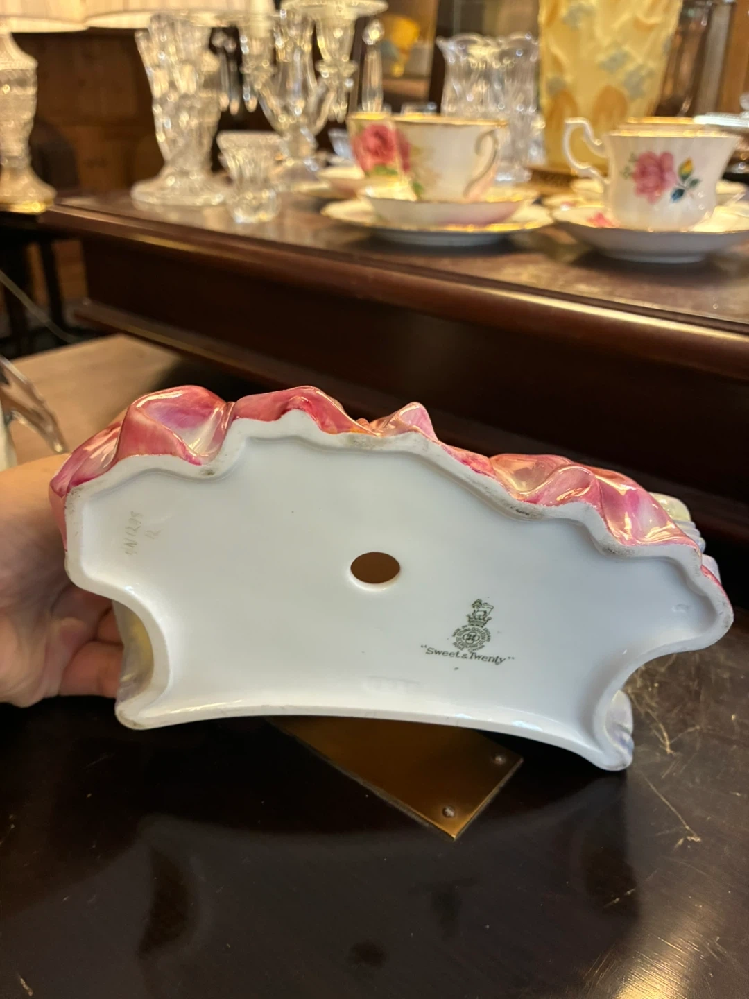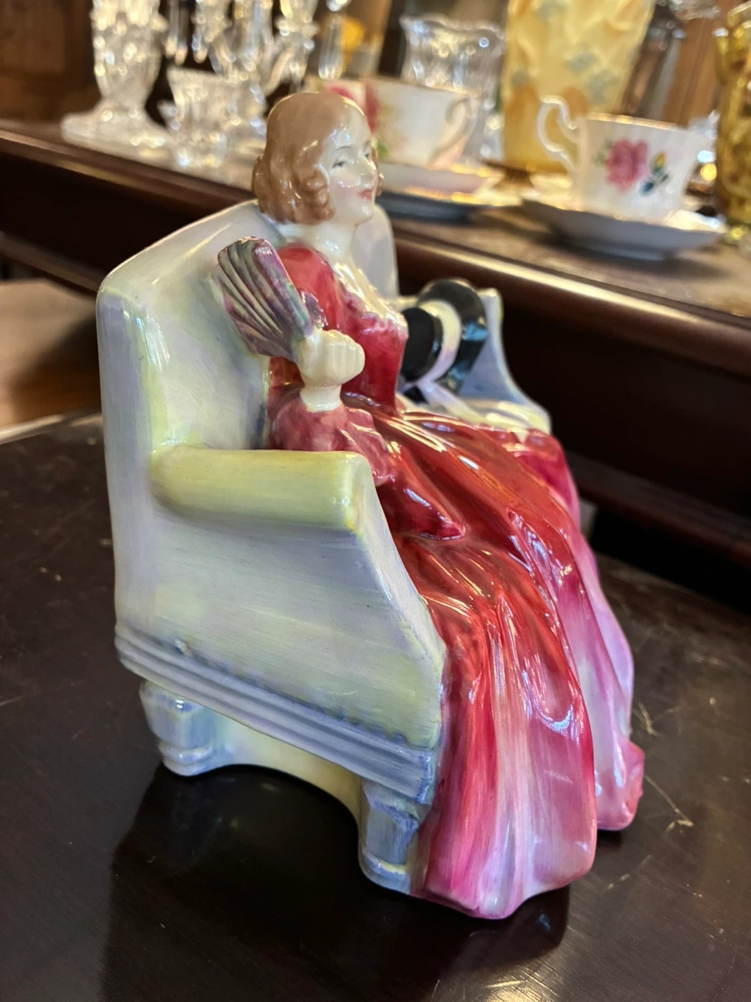 10Here's a lovely Royal Doulton figurine named 'Sweet & Twenty'! It features a lady in a red dress sitting on a chair, holding a fan. A beautiful piece for any collector or as a decorative item for your home