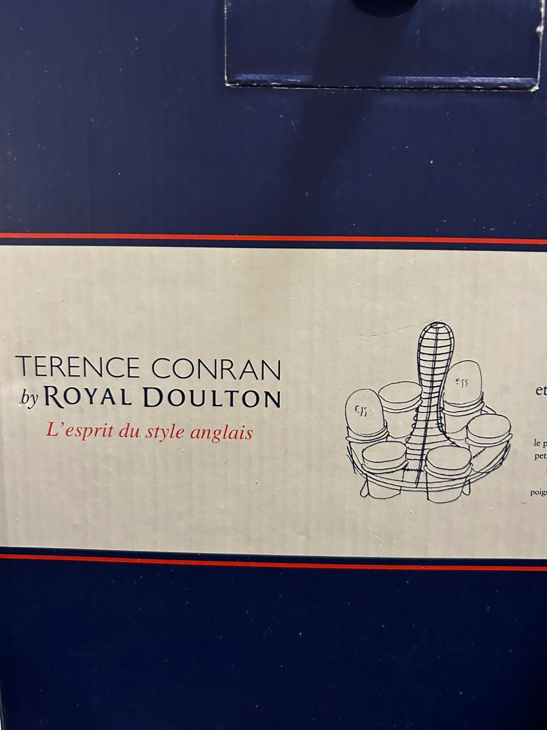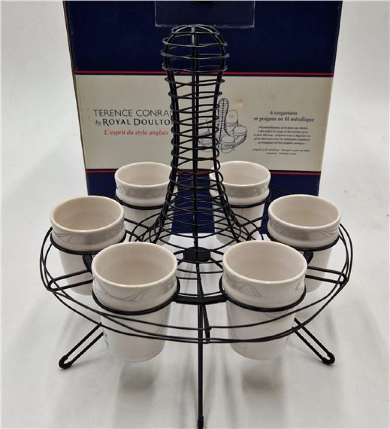 10New in box. Six-piece cup and saucer set. Black wire rack. Terence Conran design. By Royal Doulton