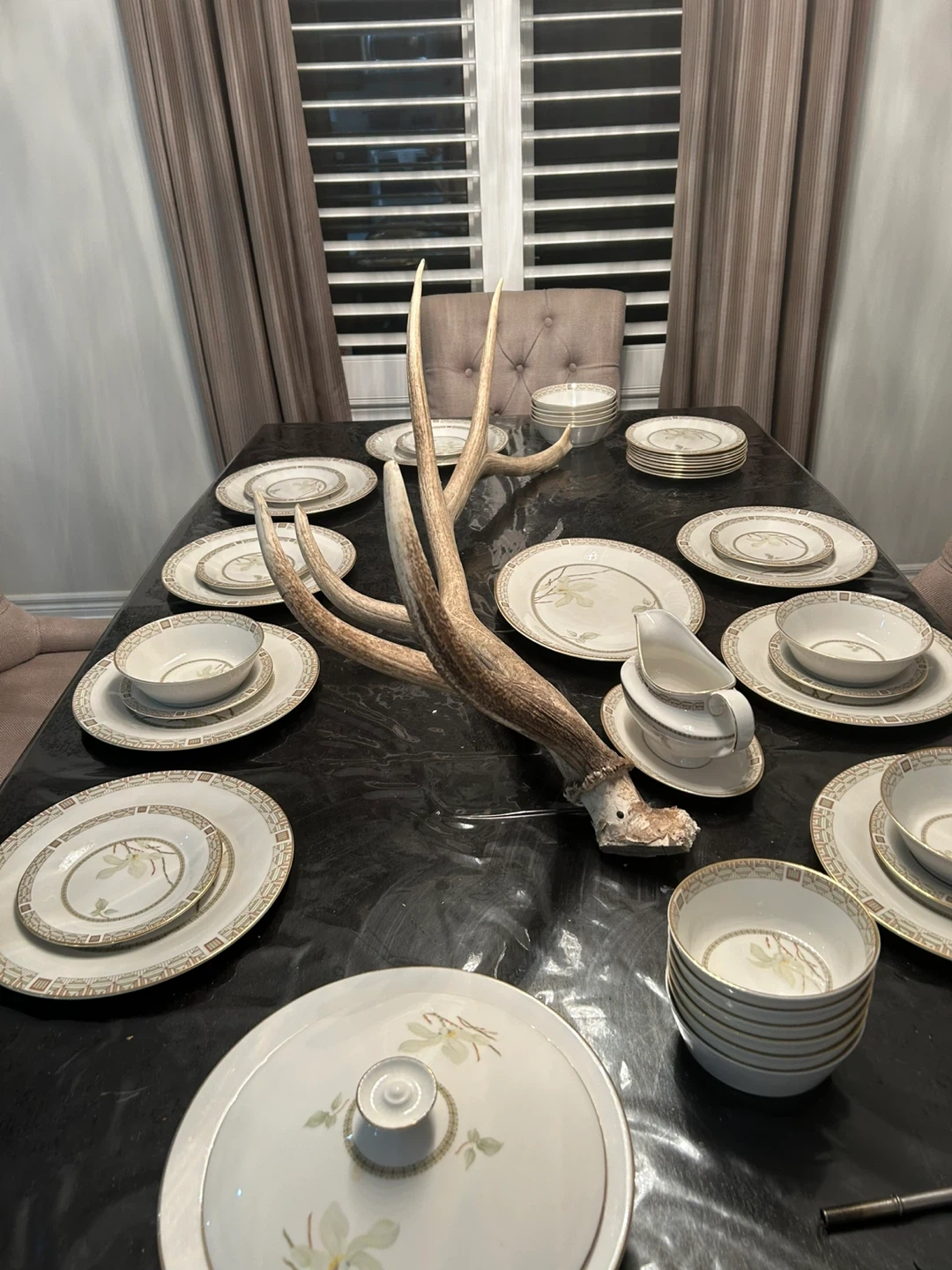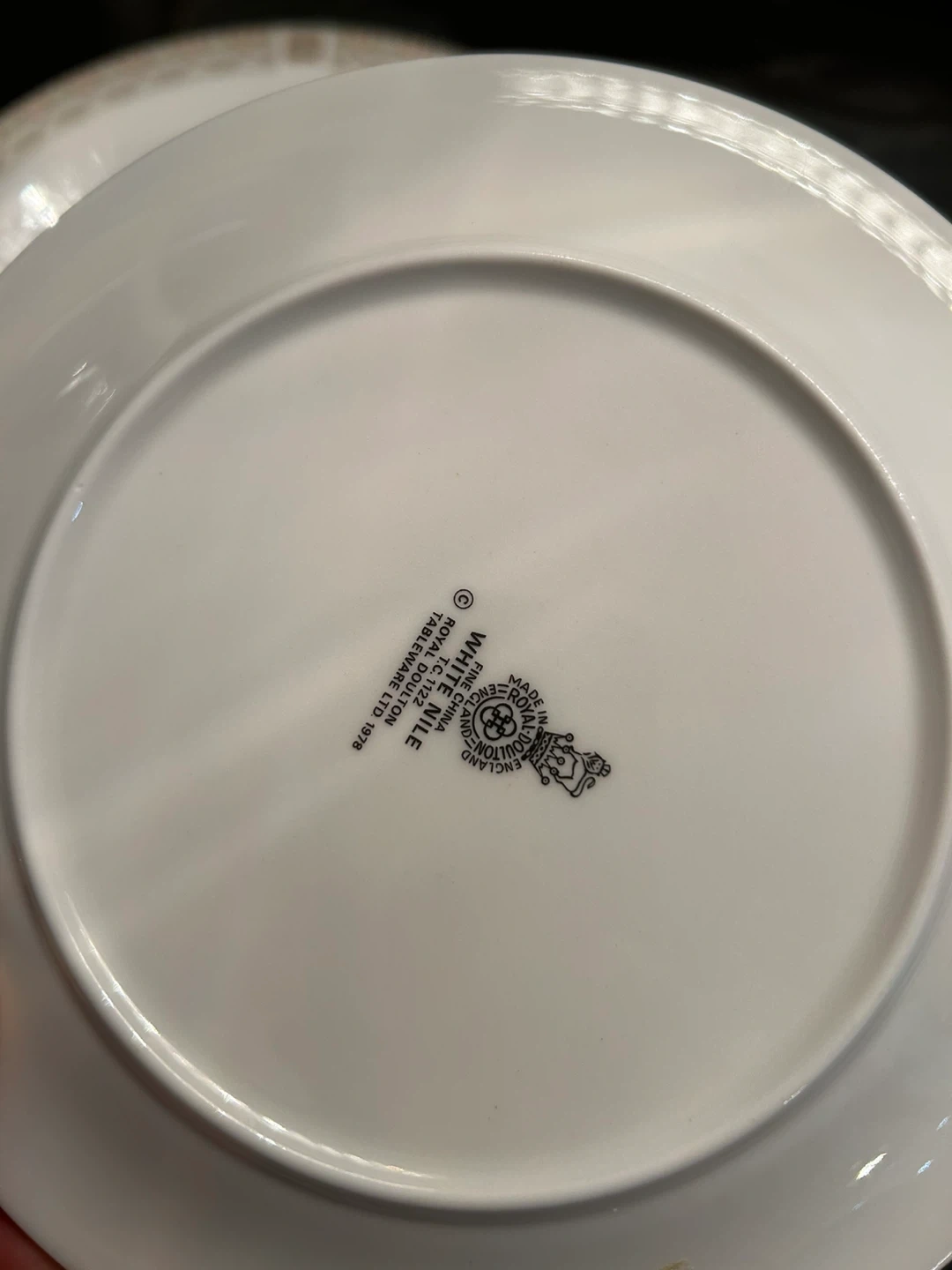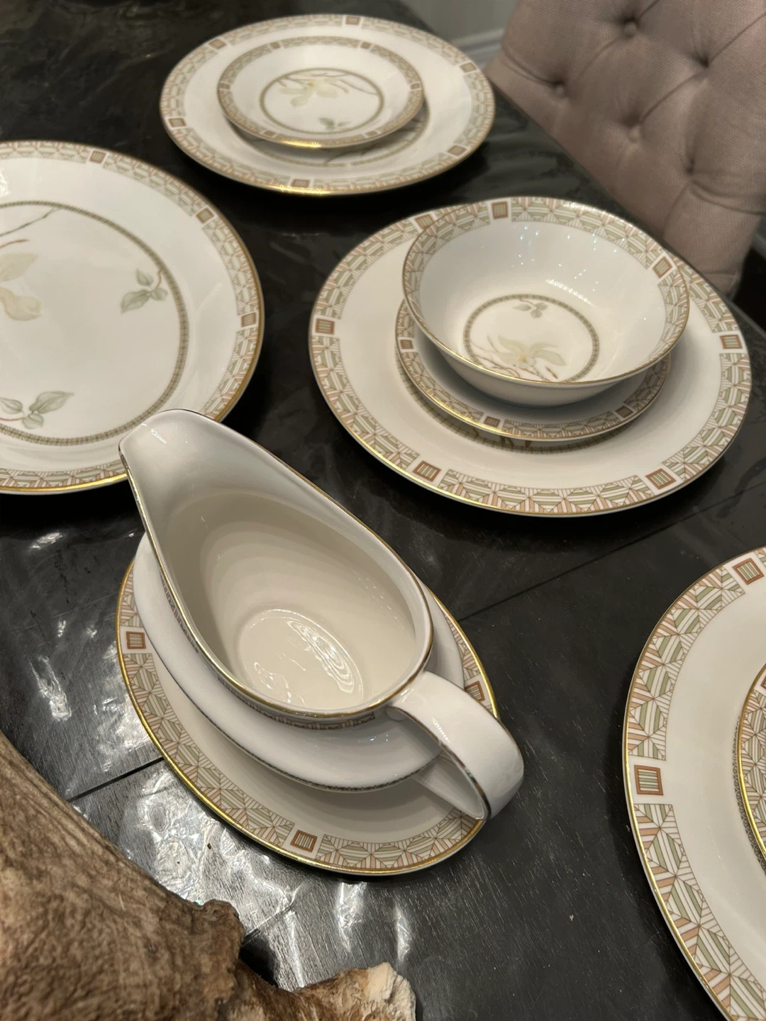 Selling a Royal Doulton White Nile fine china set. The set features a delicate floral design with a geometric border. There are several plates, bowls, and serving dishes included. A beautiful addition to any dining collection!