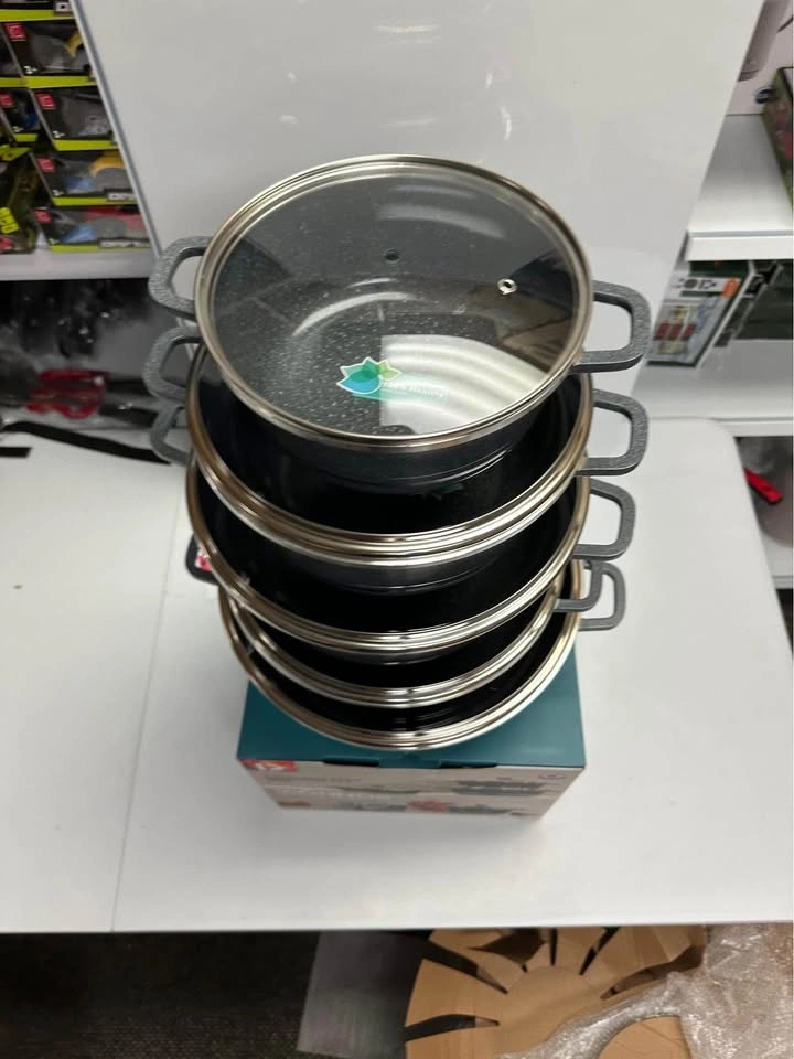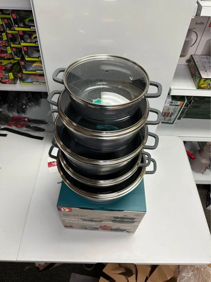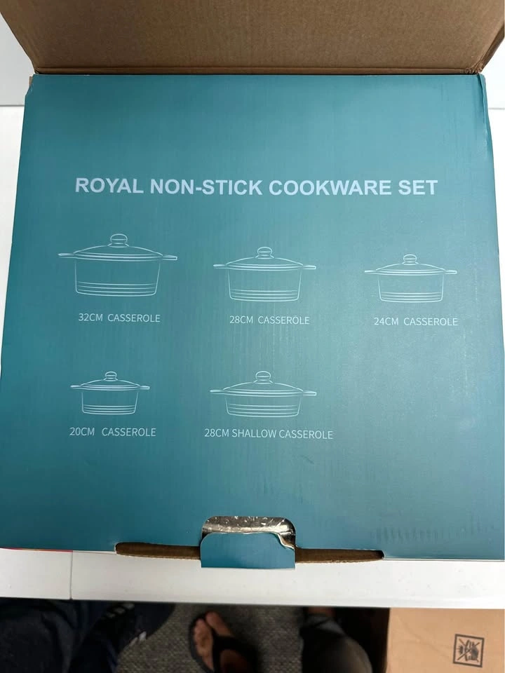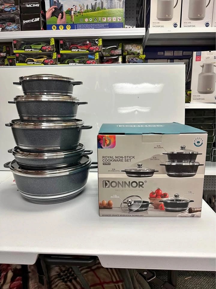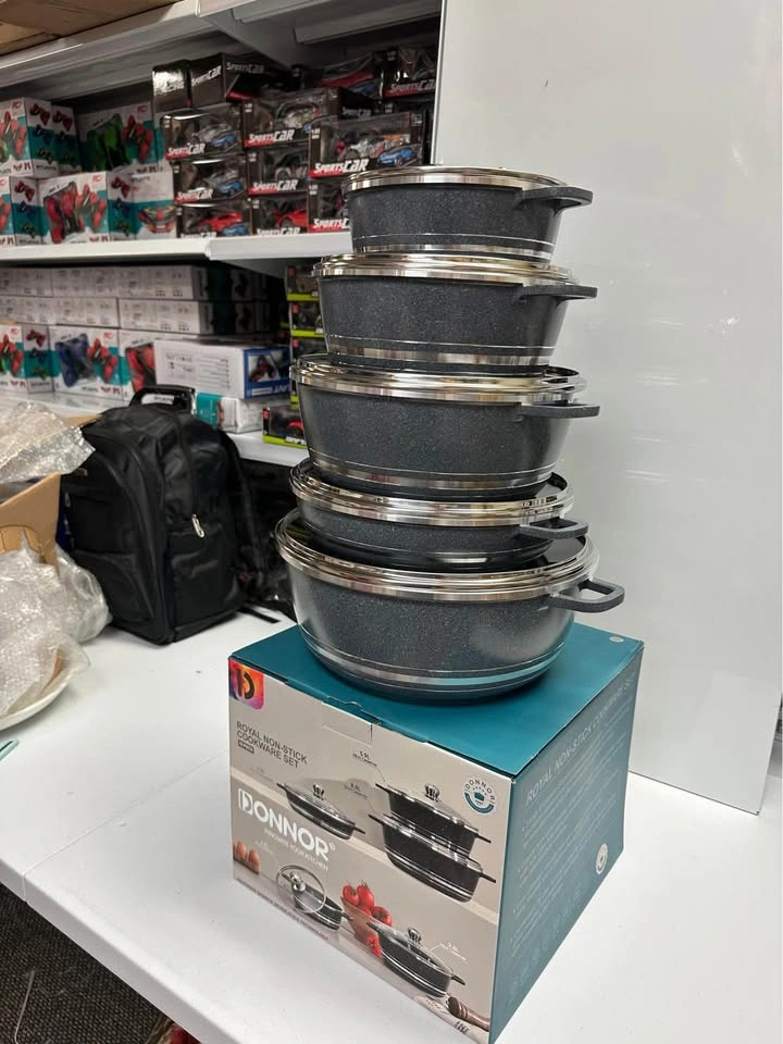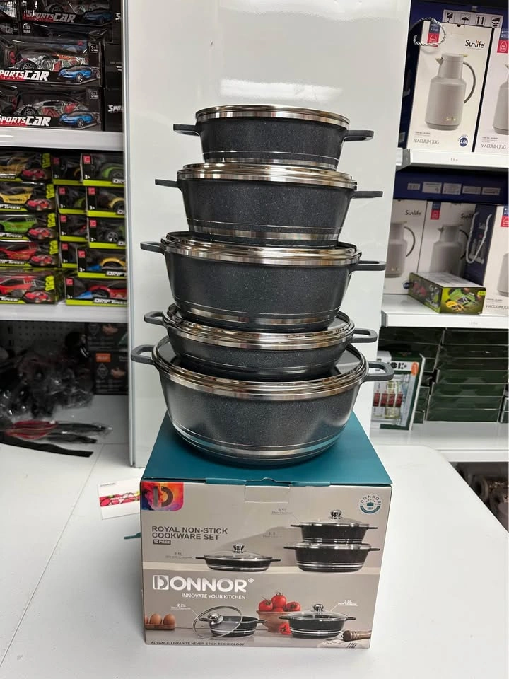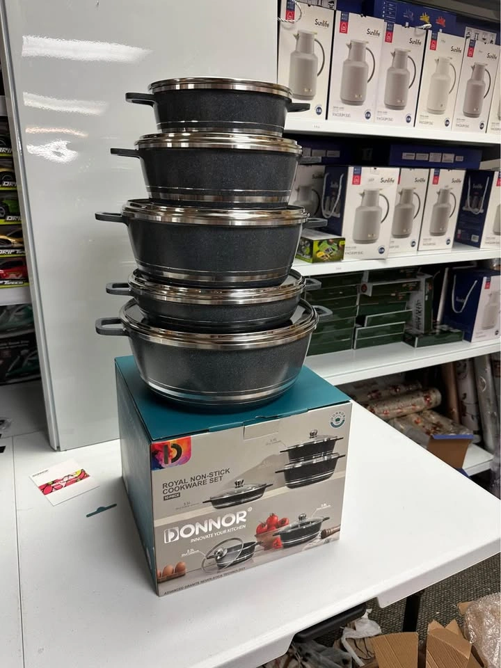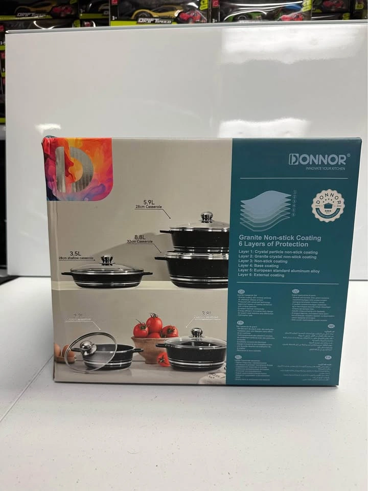 Transform your kitchen into a space of creativity and convenience with the ROYAL Non-Stick Cookware Set by DONNOR. Crafted for those who value quality, health, and efficiency, this collection redefines the art of cooking. What’s Inside the Set: · 32cm Casserole (Ideal for family meals) · 28cm Casserole (Perfect for everyday cooking) · 24cm Casserole (Great for smaller dishes) · 20cm Casserole (Quick and easy meals) · 28cm Shallow Casserole (For frying and grilling) Why You’ll Love It: · Advanced Granite Non-Stick Coating: No sticking, no scrubbing—just flawless results every time. · 10-Layer Premium Coating: Ensures even heat distribution for perfectly cooked meals. · Healthier Cooking: Cook with minimal oil while preserving taste and nutrition. · Durable & Long-Lasting: Built to withstand daily use without losing quality. · Effortless Cleaning: A quick wipe is all it takes to restore its shine. Whether you're a seasoned chef or just starting your culinary journey, the ROYAL Cookware Set is designed to inspire and simplify. Bring innovation to your kitchen with DONNOR—where great meals begin.