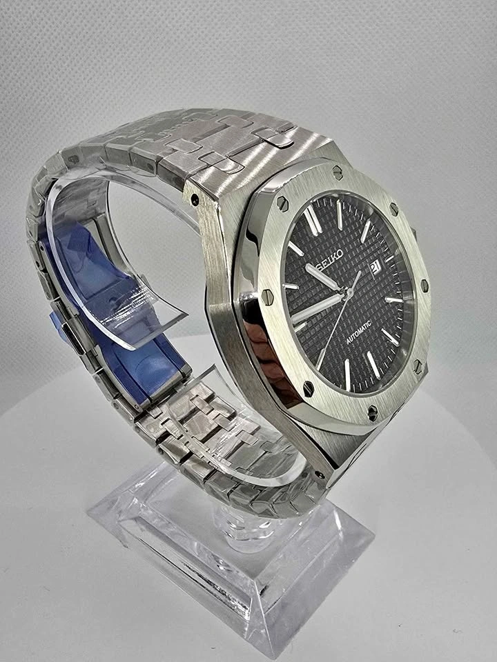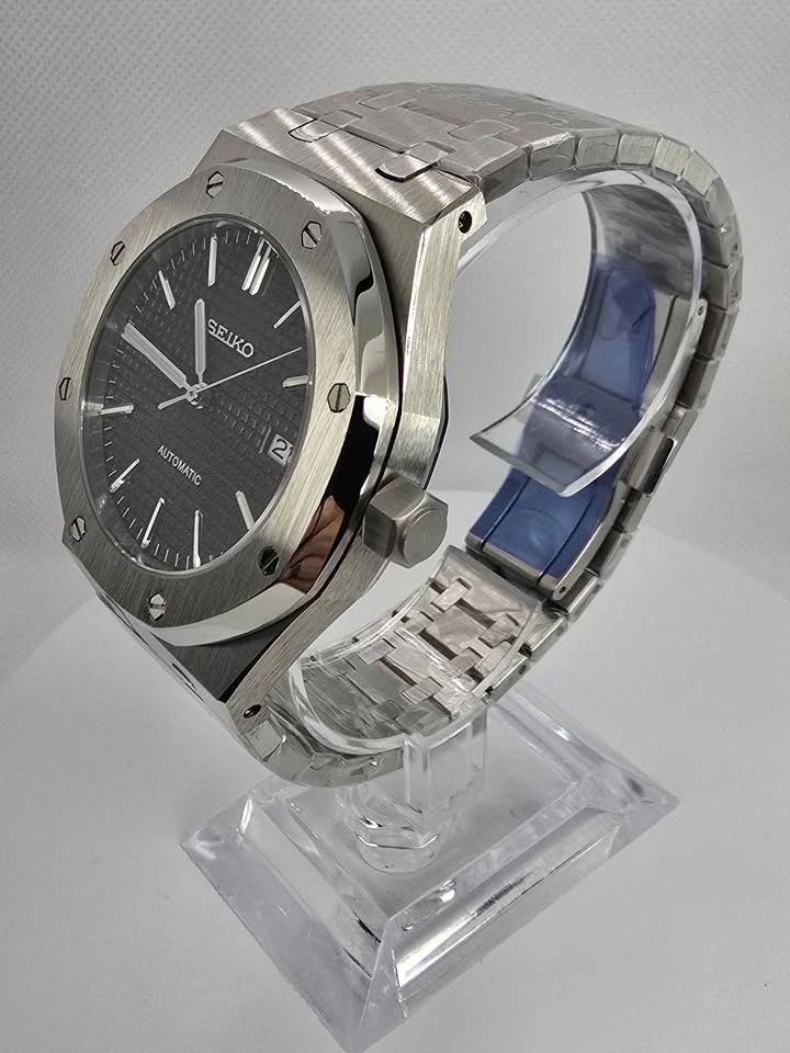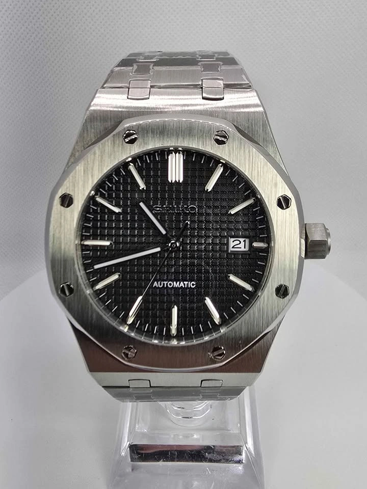 This is a custom Seiko mod built with the reliable NH35 automatic movement (hacking + hand-winding). It’s styled after the famous Royal Oak, giving you that luxury look without the luxury price tag. Details: • Automatic Seiko NH35 movement • Stainless steel case & bracelet • Black textured dial • Sapphire crystal • Date window at 3 o’clock • Exhibition caseback ✅ Runs great, keeps solid time, and has that sharp integrated-bracelet style that stands out on the wrist. 🔧 Custom Mods Available I also build Seiko mods by request — different dials, bezels, cases, you name it. • $100 deposit required 2–3 weeks turnaround time Let me know if you're interested!