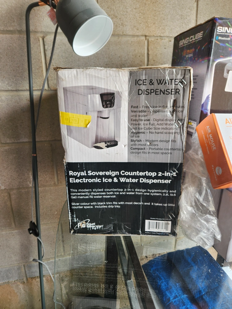 Selling a Royal Sovereign countertop 2-in-1 electronic ice and water dispenser. It's a modern styled design that dispenses both ice and water from one system. It features a 2.2L manual fill water reservoir. The dispenser is silver in colour with black trim and includes a drip tray. It's compact and portable so it fits in most spaces