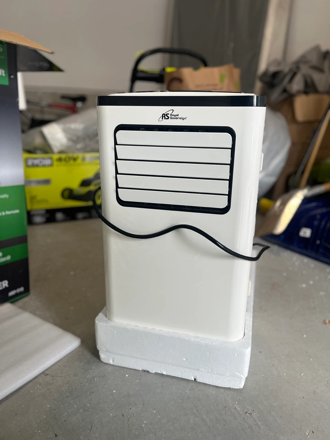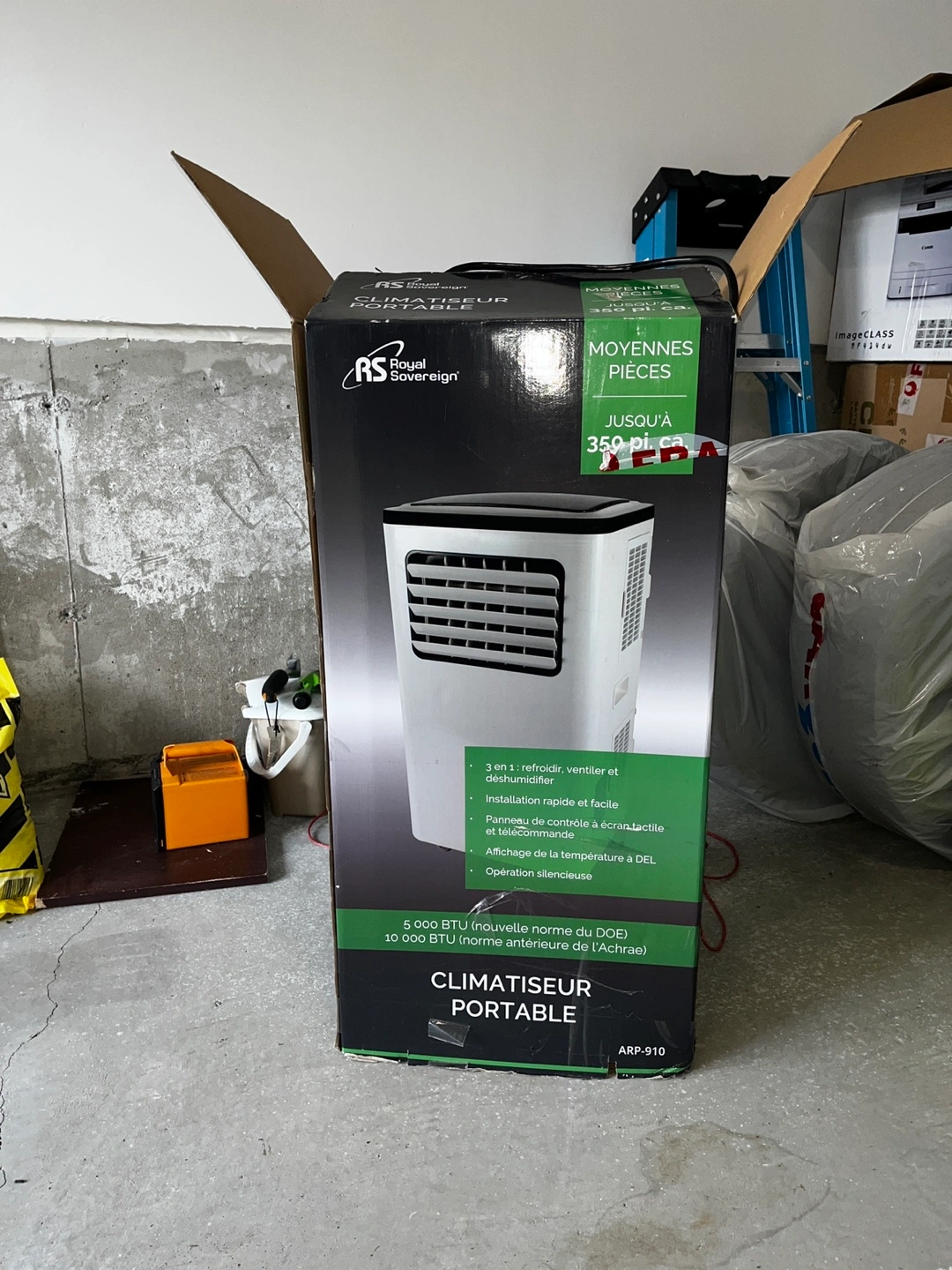 Selling a Royal Sovereign portable air conditioner, model ARP-910. It's in its original box and ready to cool down a space up to 359 square feet. It can cool, ventilate, and dehumidify.