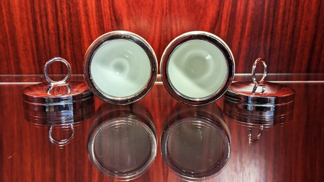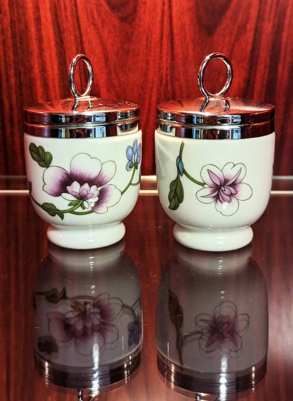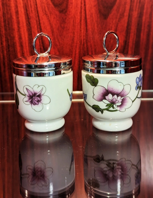 If you are seeing this Ad, then this item is still available PRICE IS FIRM This sale is for 2 very nice and clean Type 9 Royal Worcester Fine Porcelain Standard Size Egg Coddlers - Astley - Made in England. This pattern consists of stylized purple and white flowers. Details : • Cup size - 2" in diameter - 2.5" in height • Cup and lid size - 3.5" inches to top of lid finial • Scrolled W Inside a Circle with "Royal Worcester Porcelain / Made in England" in black indicating that this cup was manufactured between 1950-1983 • No chips, hairlines, crazing or discoloration. • Chrome lid and threaded coddler neck also in excellent condition These items come from a smoke-free home. Pick-up in Pickering ONLY