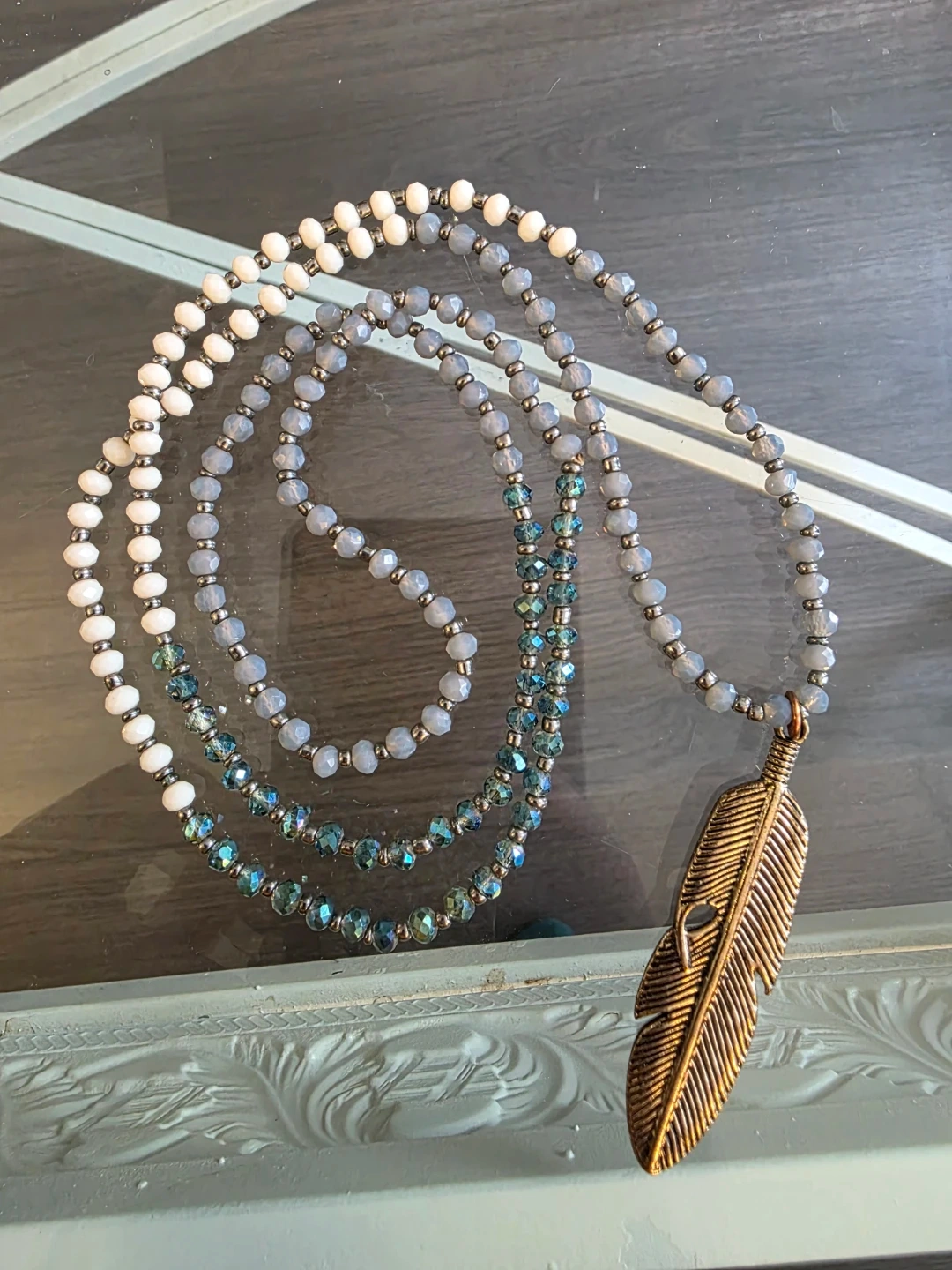 Beautiful long necklace featuring white, grey, and blue faceted beads. It's accented with a large, antique-look gold feather pendant. This necklace adds a touch of boho style to any outfit!