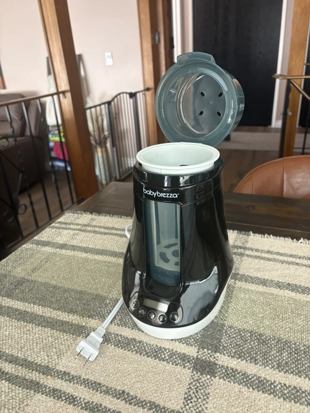 This Baby Brezza bottle warmer is black and white. It has a digital display and control buttons on the front. The lid is clear and has a handle. It includes the main unit and power cord.