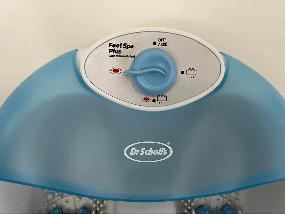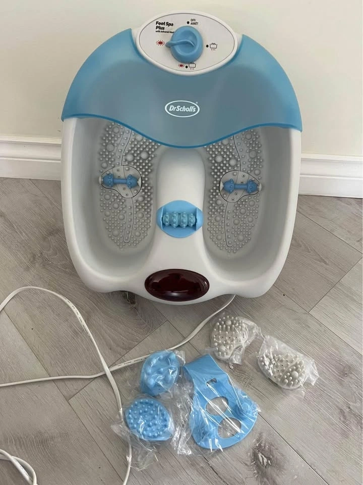 Dr. Scholl's Foot Spa Plus with multiple settings for Infrared Heat and Massage. Features interchangeable base plates and attachments for vibration, acupressure, and roller massage. In clean, excellent condition.