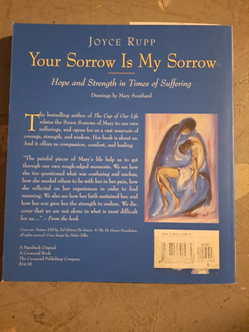 This book is a hardcover edition of Joyce Rupp's "Your Sorrow is My Sorrow: Hope and Strength in Times of Suffering."" It includes drawings by Mary Southard.