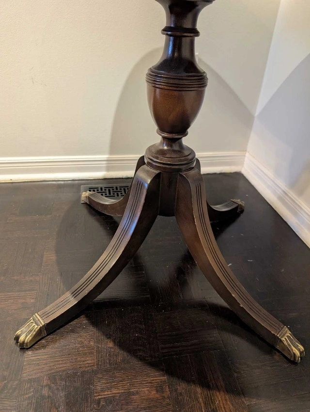 This is a round side table, perfect for adding a touch of elegance to any room. The table features a drawer and stands on clawed feet. It's in good condition and ready for a new home. Looking for a spot to perch your Earl Grey or perhaps a stylish stand for your prized gnome collection? This table is ready to serve! (Please note: Gnomes and tea not included.) If the ad is up, it's available! Cash accepted.