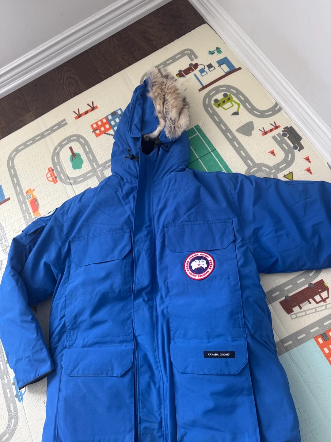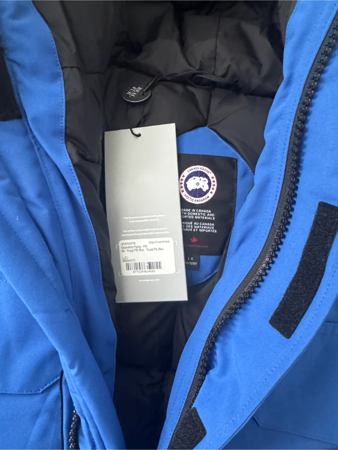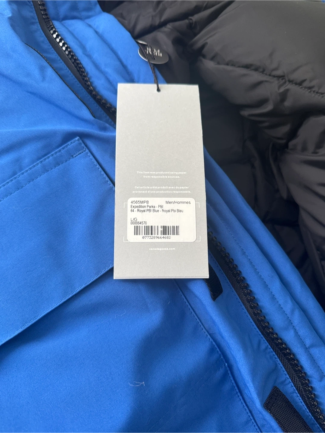 This is a new Canada Goose Expedition Parka in Royal Pbi Blue. It's a size L men's jacket. It features a fur-lined hood and durable construction for extreme cold.