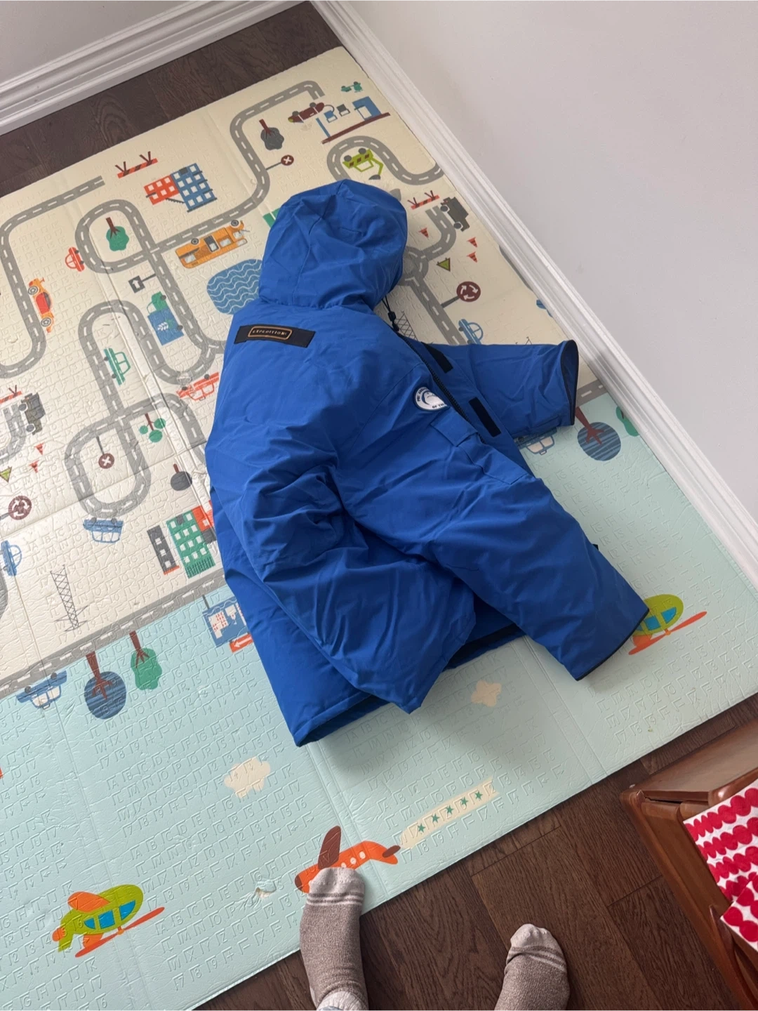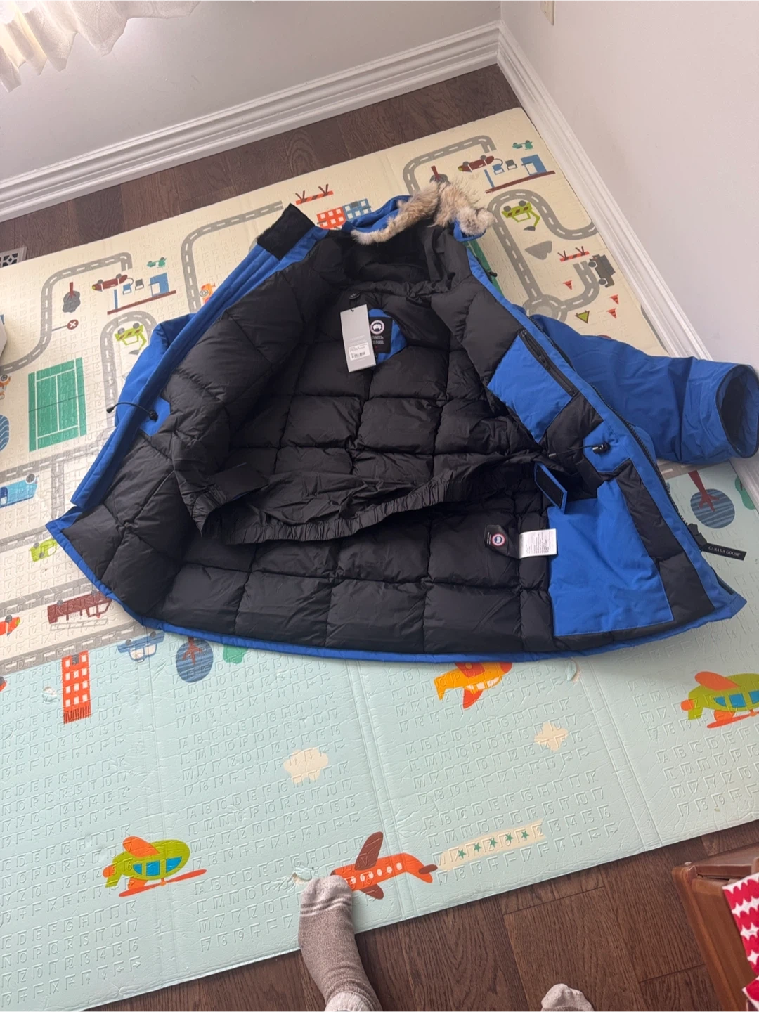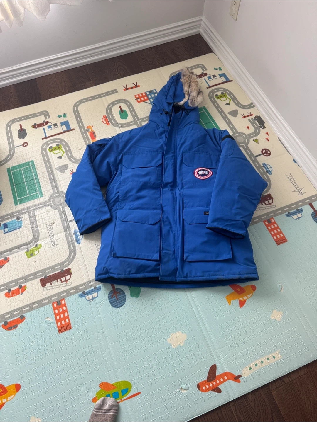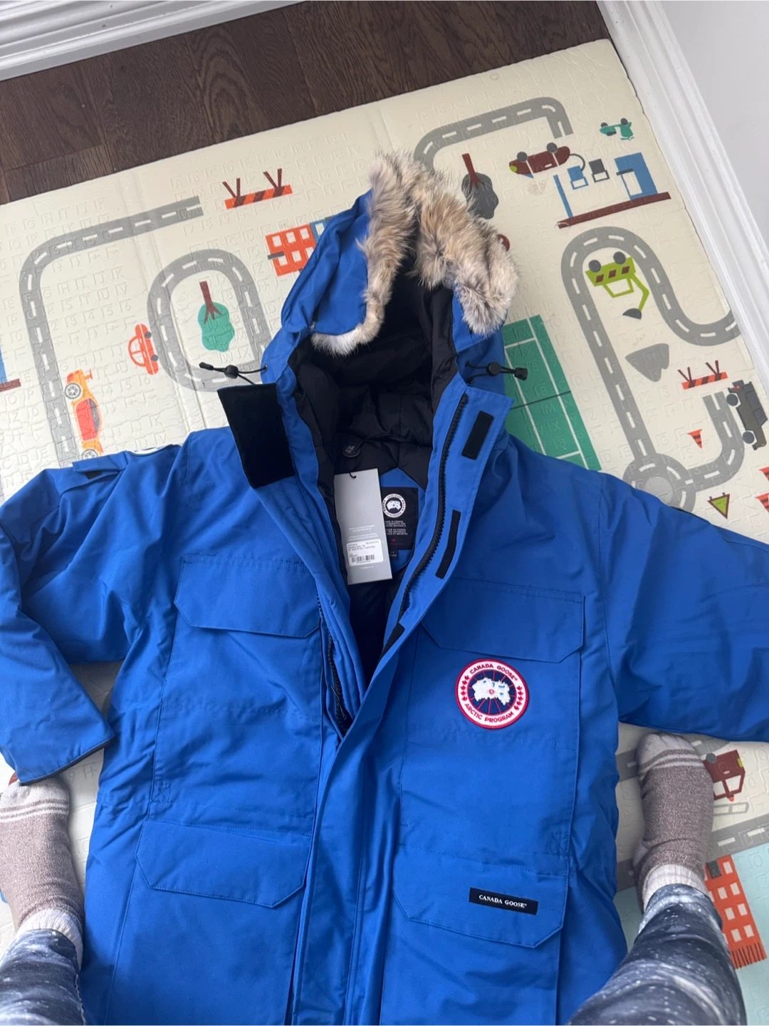 This is a new Canada Goose Expedition Parka in Royal Pbi Blue. It's a size L men's jacket. It features a fur-lined hood and durable construction for extreme cold.
