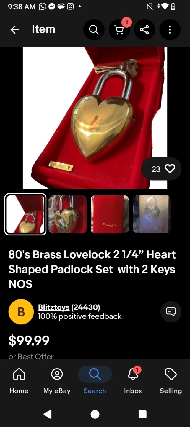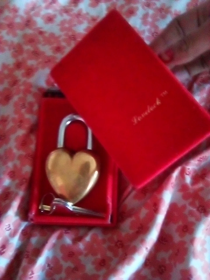 This is a vintage 80's brass heart-shaped padlock. It comes in its original red box and includes two keys. The padlock features a polished brass finish. It's a decorative piece with a classic design.