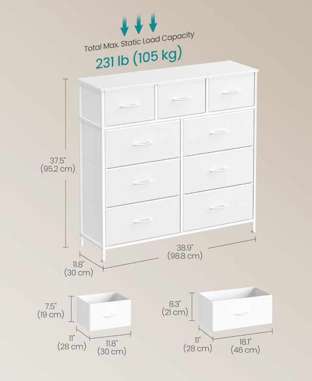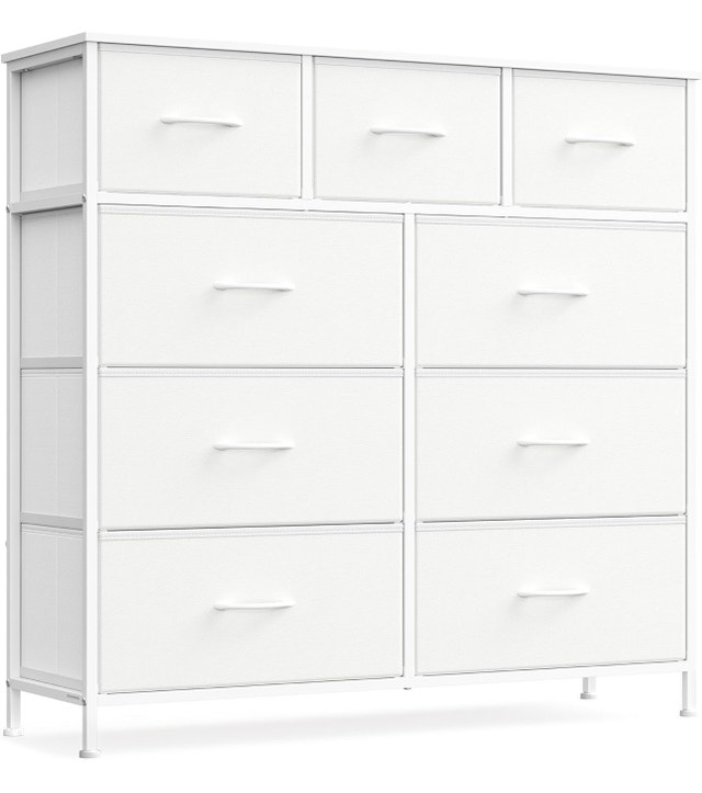This SONGMICS dresser offers ample storage with its 9 drawers and a sturdy metal frame, perfect for organizing any space. It is brand new and offers a stylish and practical storage solution. Here are some of its features: Frame Material: Metal Drawers: 9 fabric drawers Colour: White Static Load Capacity: 231 lb (105 kg) If the ad's still up, it's still up for grabs! Condition: New For Sale By: Owner