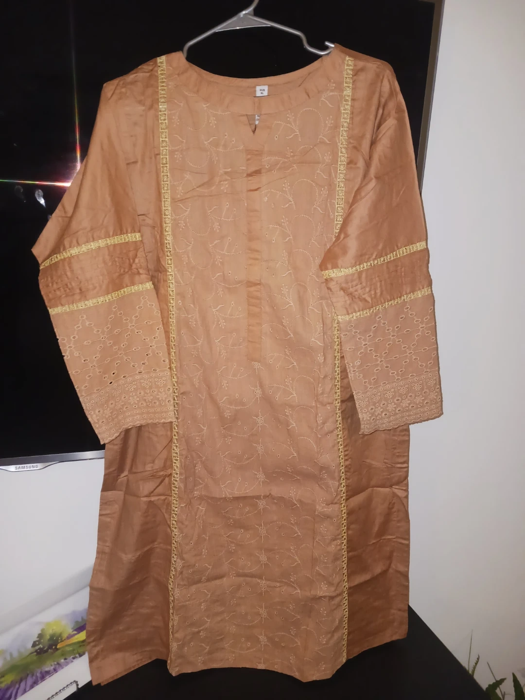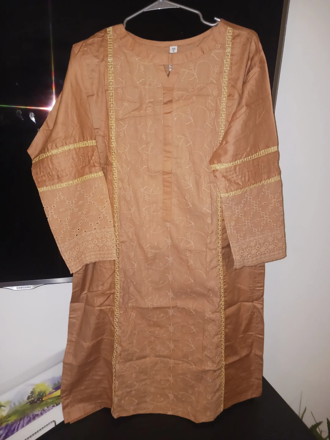 A lovely women's embroidered kurti paired with matching pants. The kurti has intricate embroidery throughout and decorative trim on the sleeves and front. Made from a smooth, light fabric perfect for warmer days. This set is suitable for casual outings or cultural events.