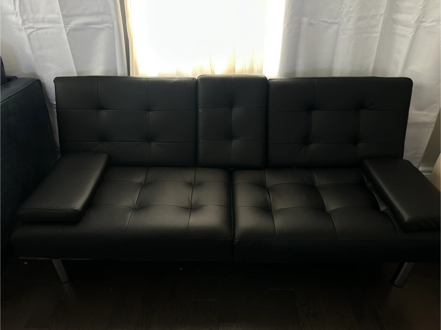 This black faux leather loveseat sofa bed offers a sleek and modern design. It features button tufting on the seat and back cushions for added detail. The sofa converts into a flat sleeping surface, making it a functional piece for small spaces. This item is a great solution for overnight guests or everyday use.