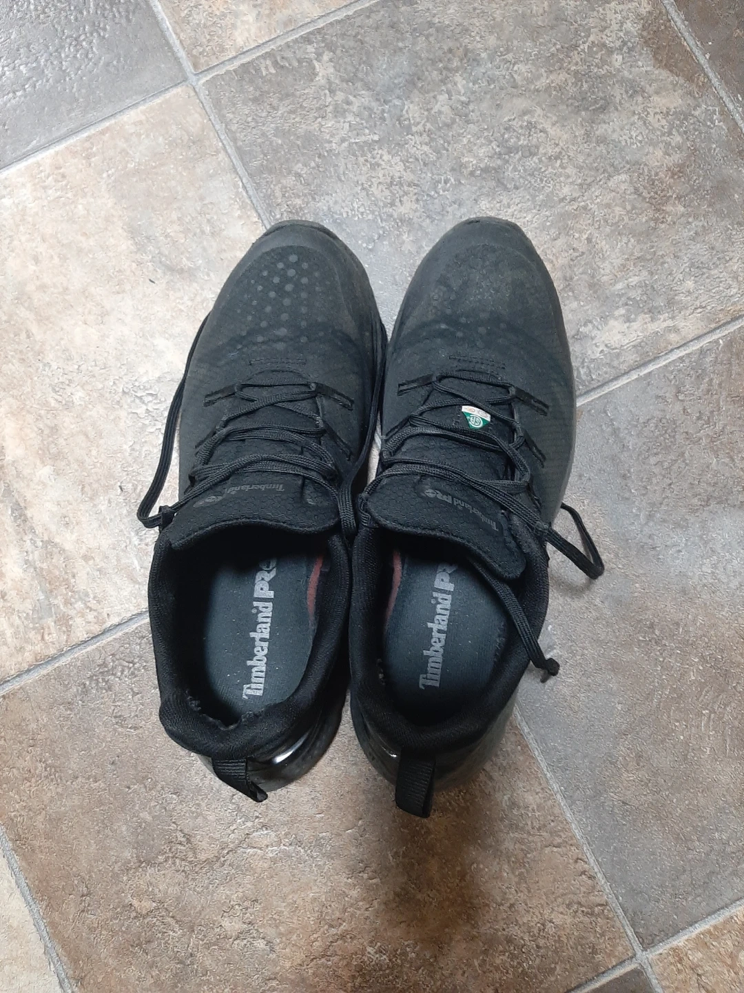 Timberland Pro safety shoes in black. These shoes offer protection and comfort for work environments. They're designed for durability on the job site.