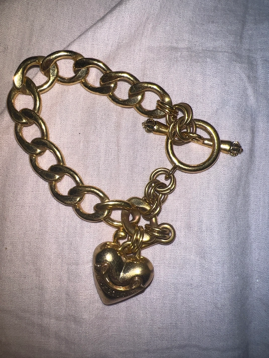 Selling a cute Juicy Couture gold-toned bracelet! It features a chunky chain and a heart charm with the Juicy Couture logo on it. Perfect for adding a bit of bling to your outfit! Meet up