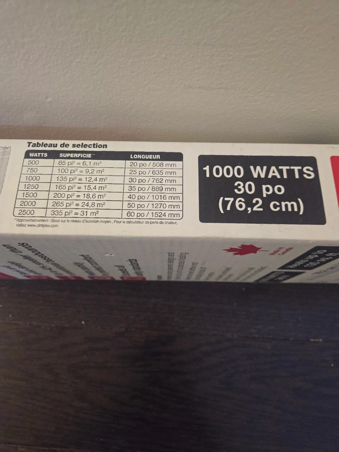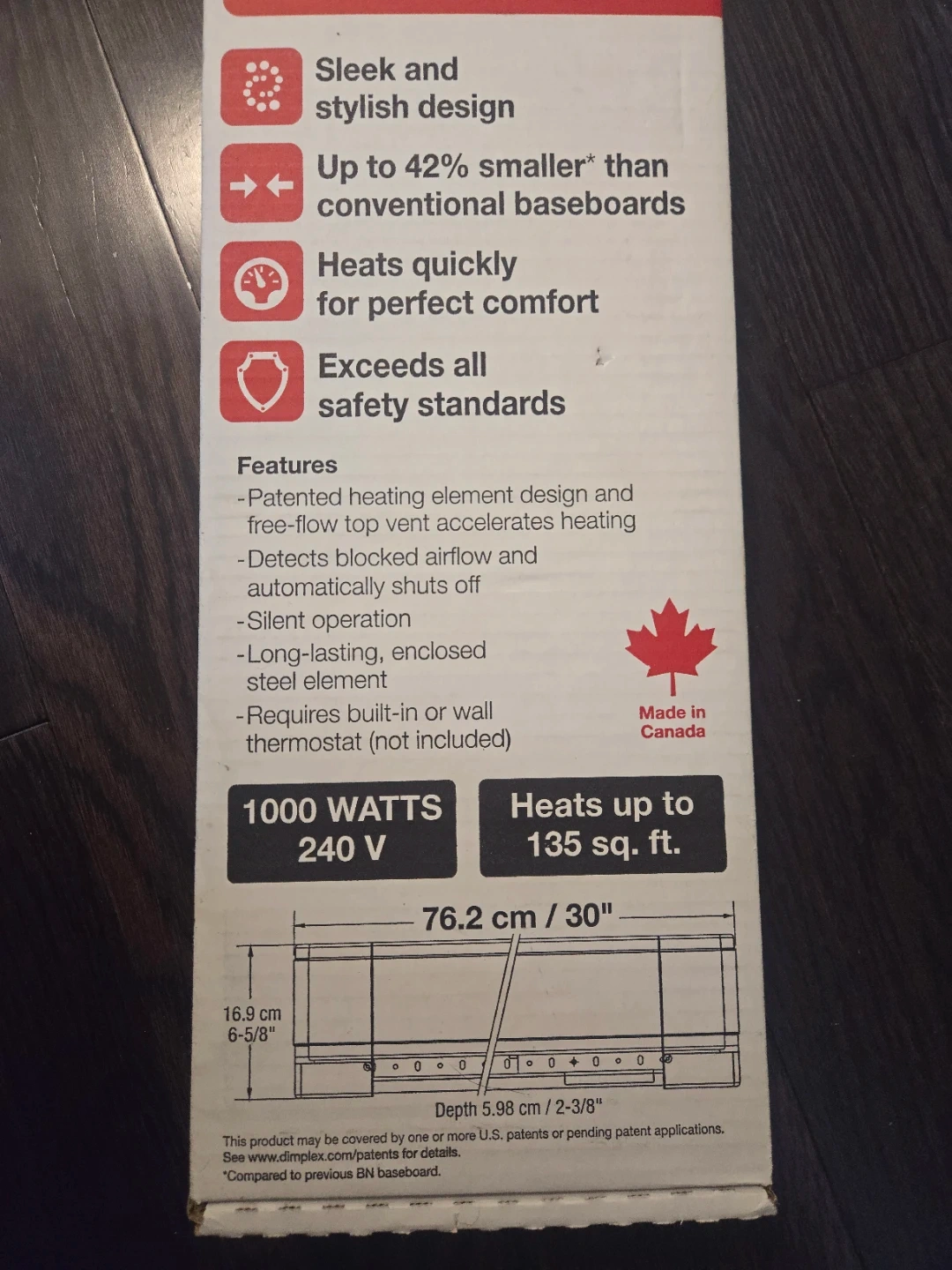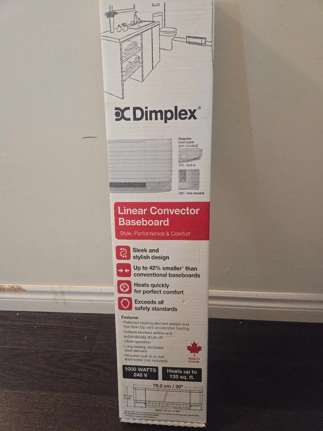 Dimplex Linear Convector Baseboard Heater with 1000 watts. It heats quickly and has a sleek, stylish design. It's made in Canada and covers up to 135 sq. ft. The length is 76.2 cm / 30 inches.
