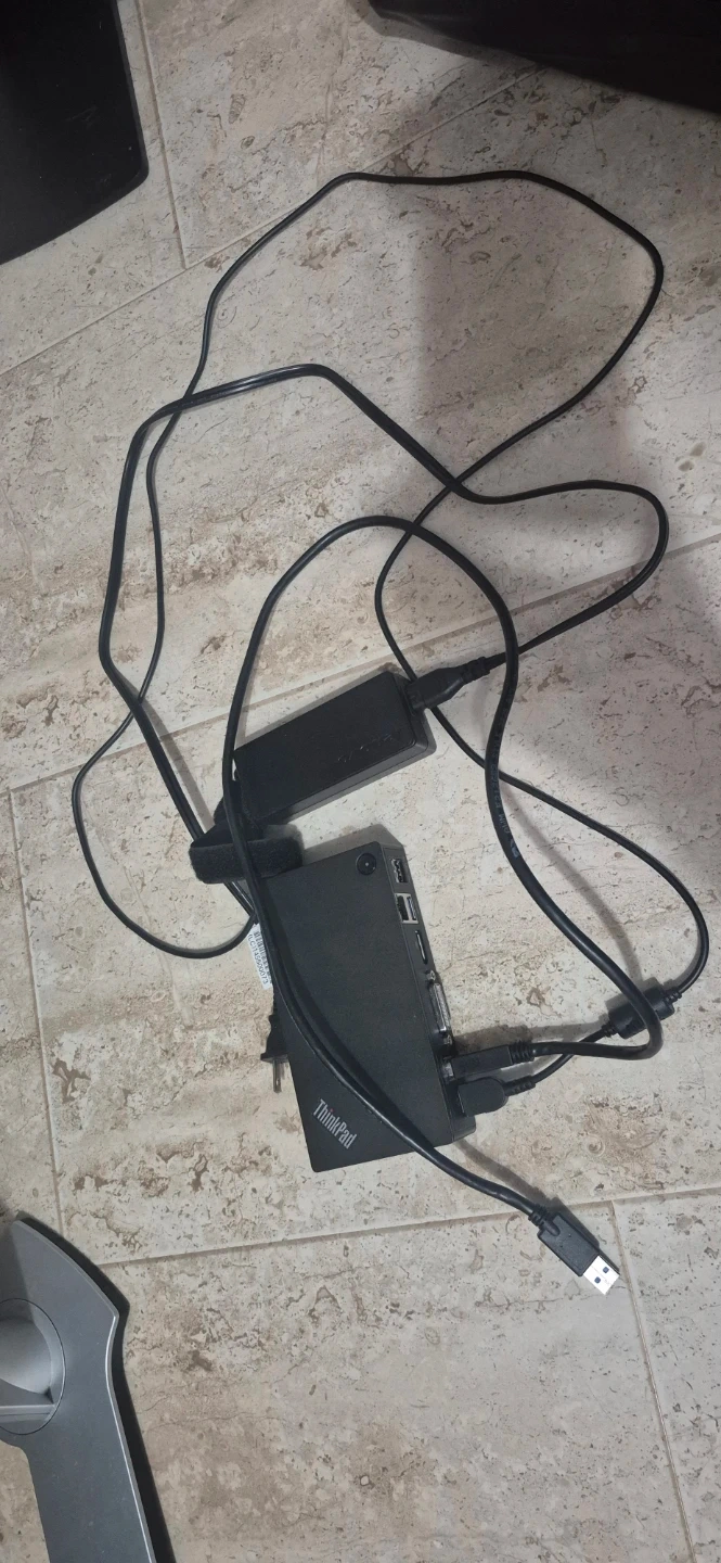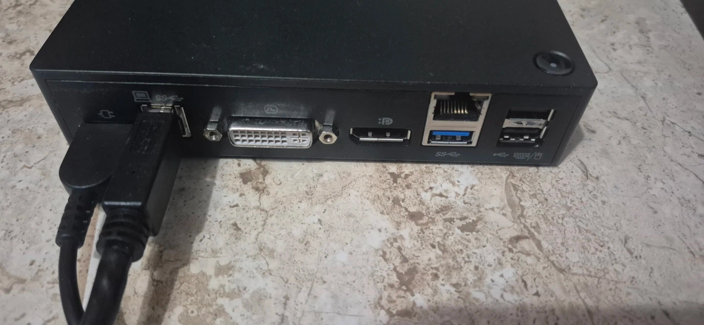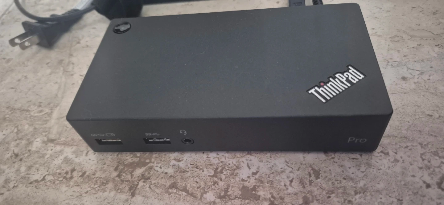 Lenovo ThinkPad Pro docking station with power adapter. It's black and includes various ports like USB, HDMI, DVI, and Ethernet. Connect multiple peripherals to your laptop with this convenient setup.