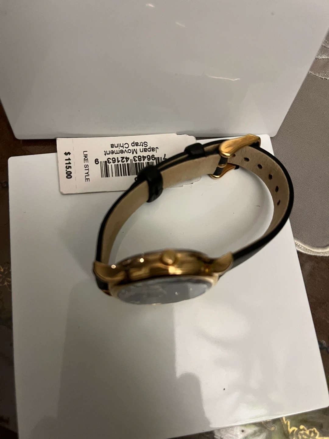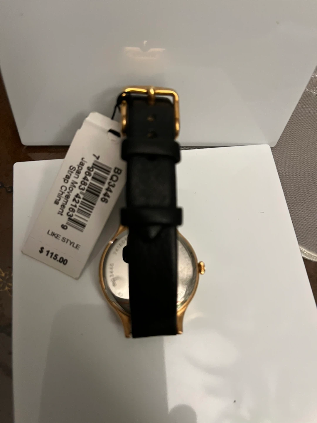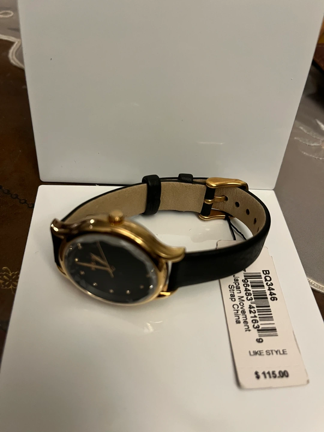 Fossil BQ3446 watch with a gold-tone case and black leather strap. Japan movement and strap made in China. Original price was $115.00.