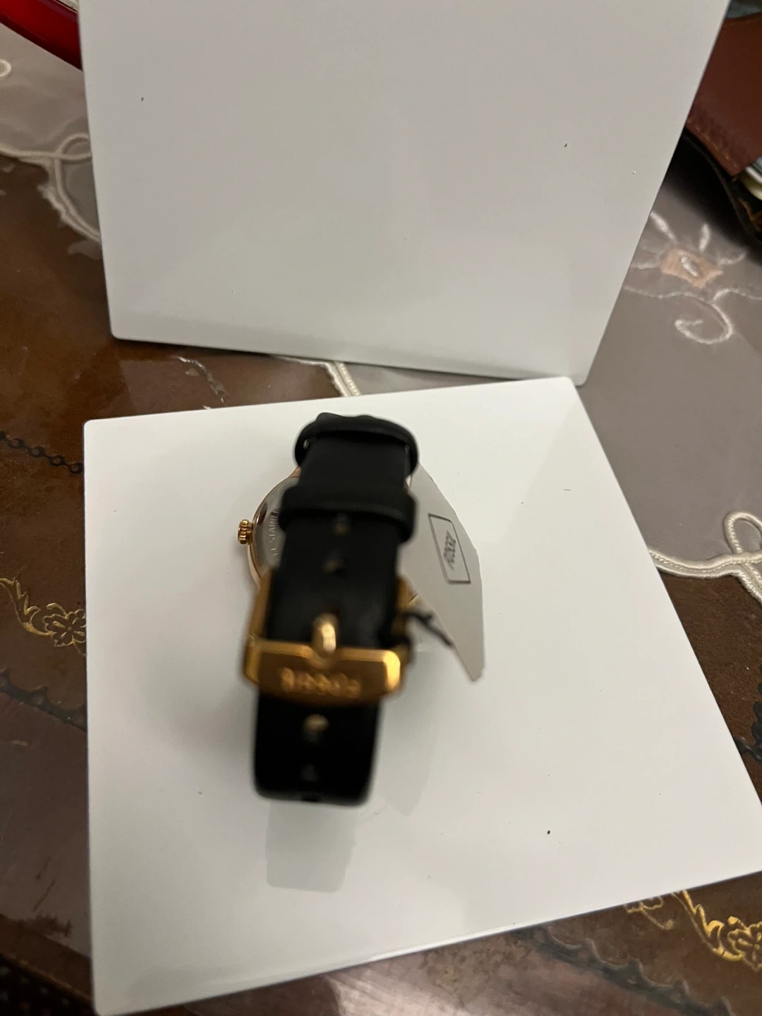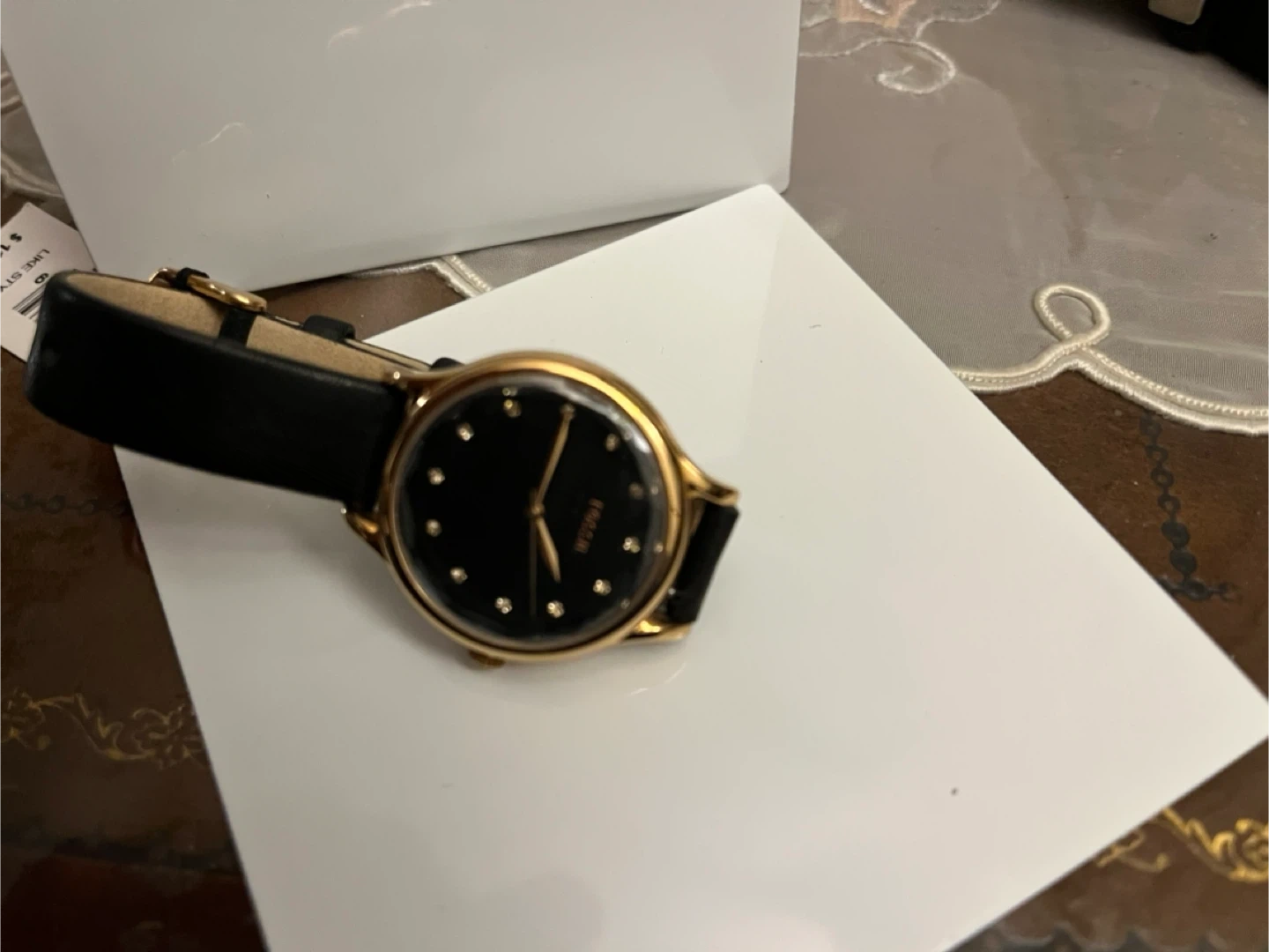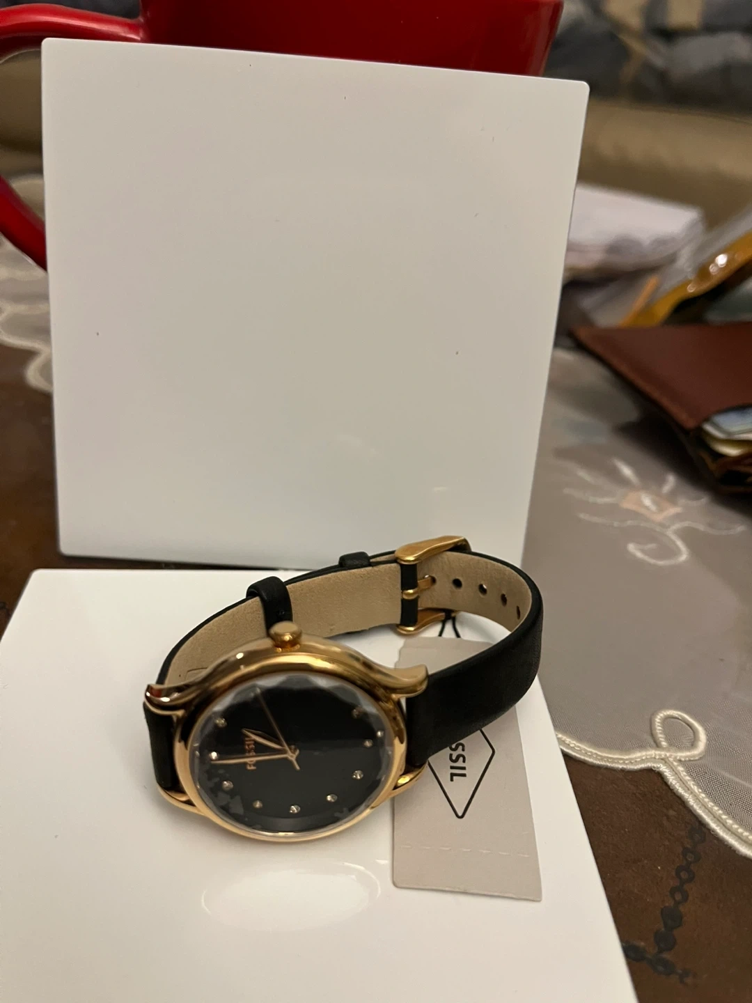 Fossil BQ3446 watch with a gold-tone case and black leather strap. Japan movement and strap made in China. Original price was $115.00.