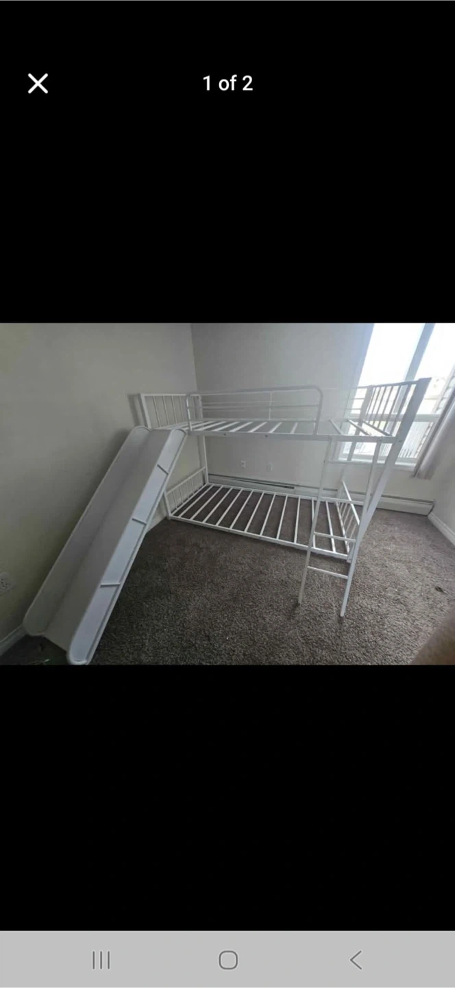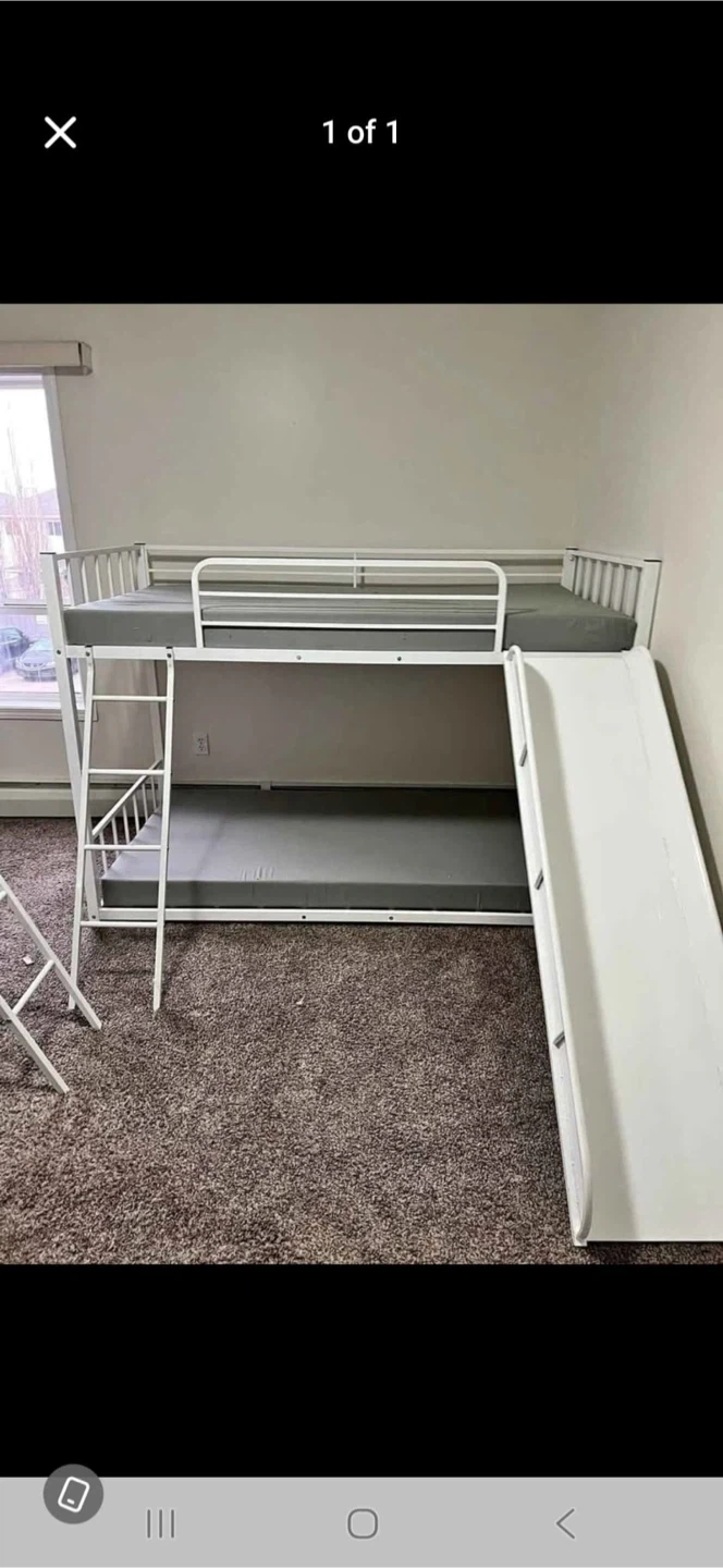 This white metal bunk bed features a fun slide for quick exits. It includes guard rails for safety on the top bunk and a sturdy ladder for access. The beds are designed to fit standard twin-sized mattresses. No delivery sorry and there is 1