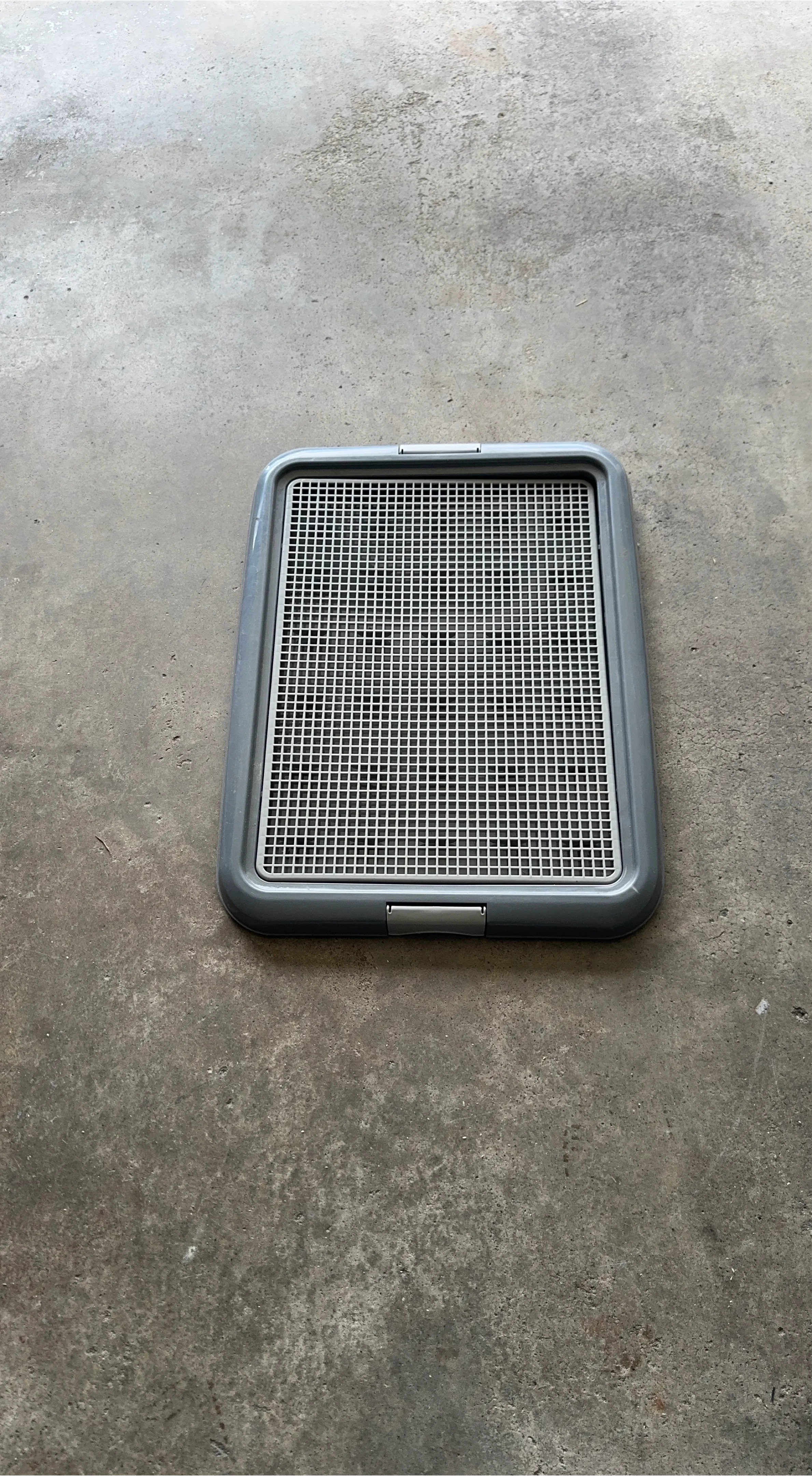 This is a grey pet training tray. It features a removable grate for easy cleaning. This tray is designed for pet potty training purposes.