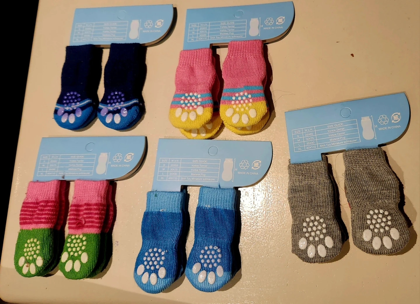 Paws-itively adorable set of 5 dog socks! ๐พ Featuring non-skid paw pads for traction and available in multiple fun designs and colors. These are a size medium, but they didn't quite fit my pupโplease double-check the measurements shown to ensure a perfect fit for yours! The price is for the whole set, not individual socks.