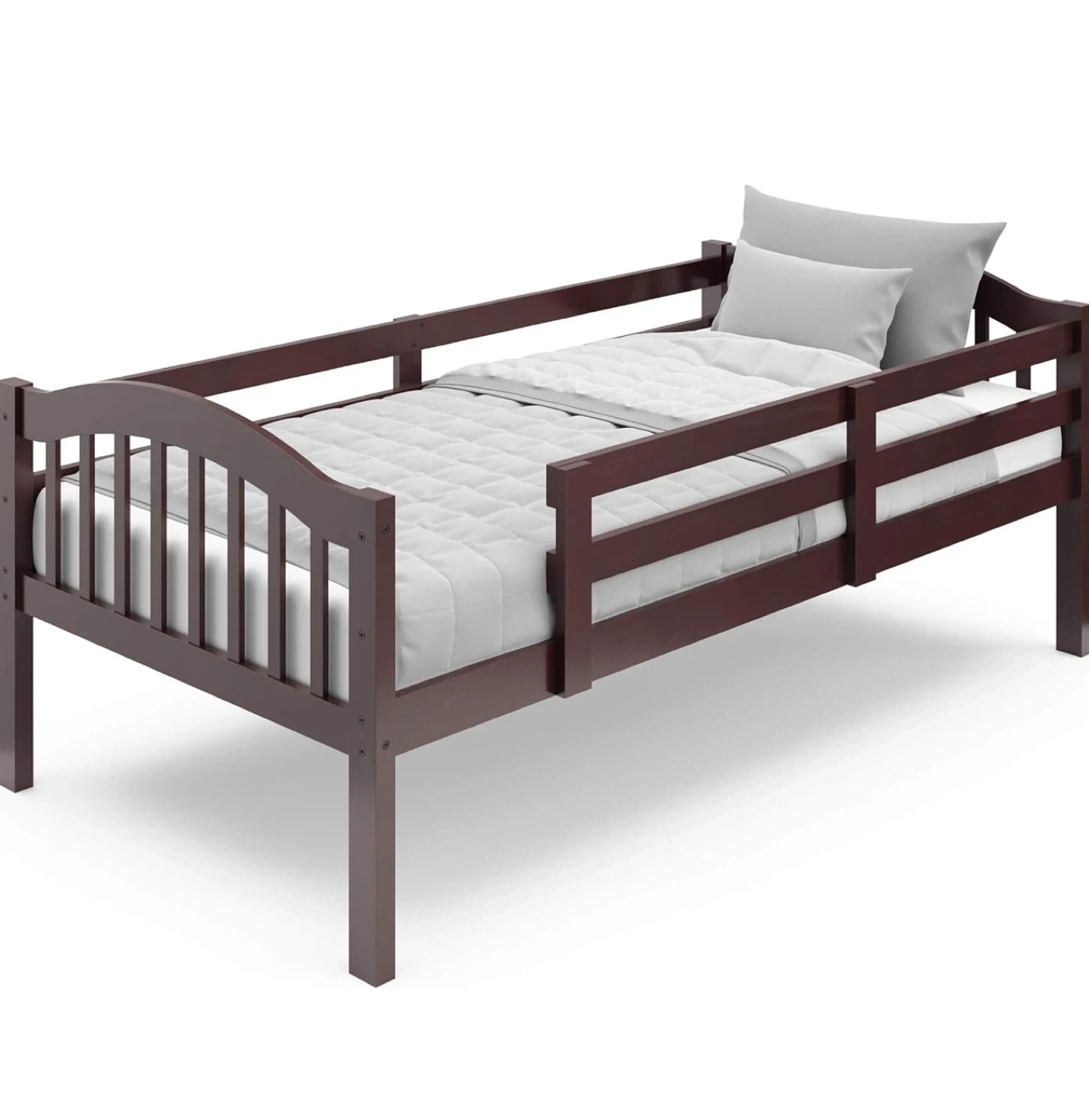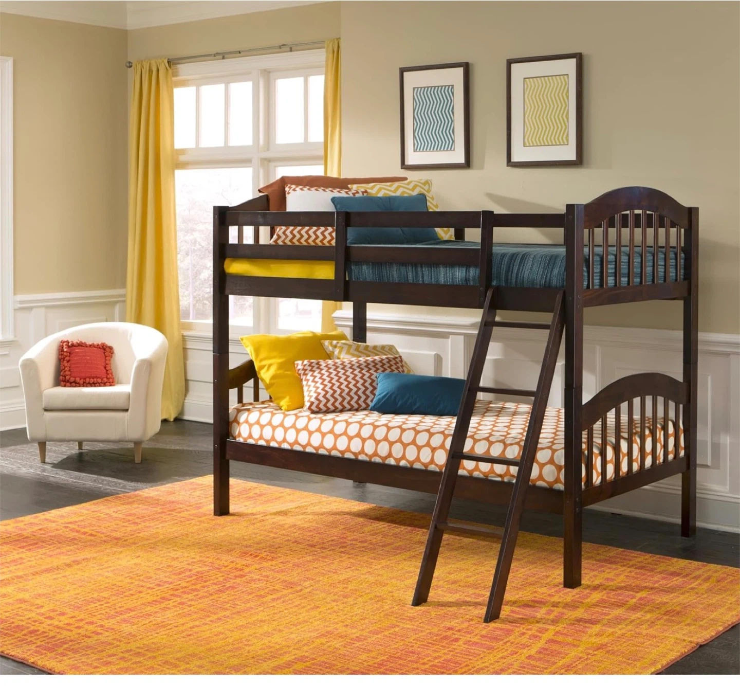Dark brown wooden bunk bed. Solid wood construction. Includes ladder for top bunk access. It's a space-saving solution for kids' rooms. Great for families with multiple children.