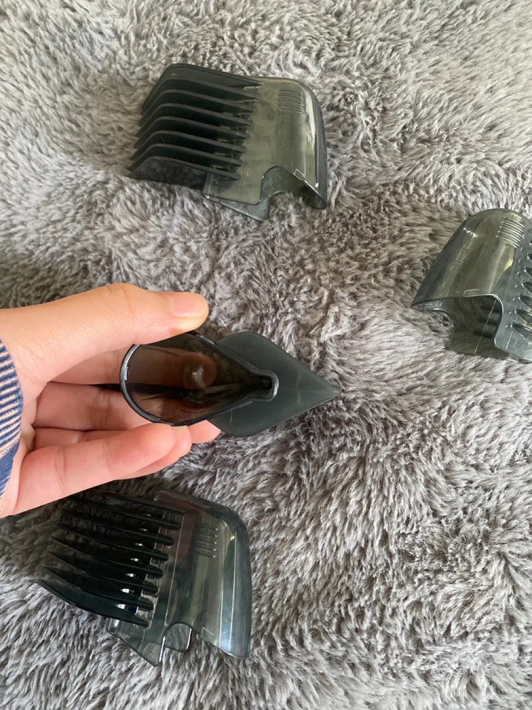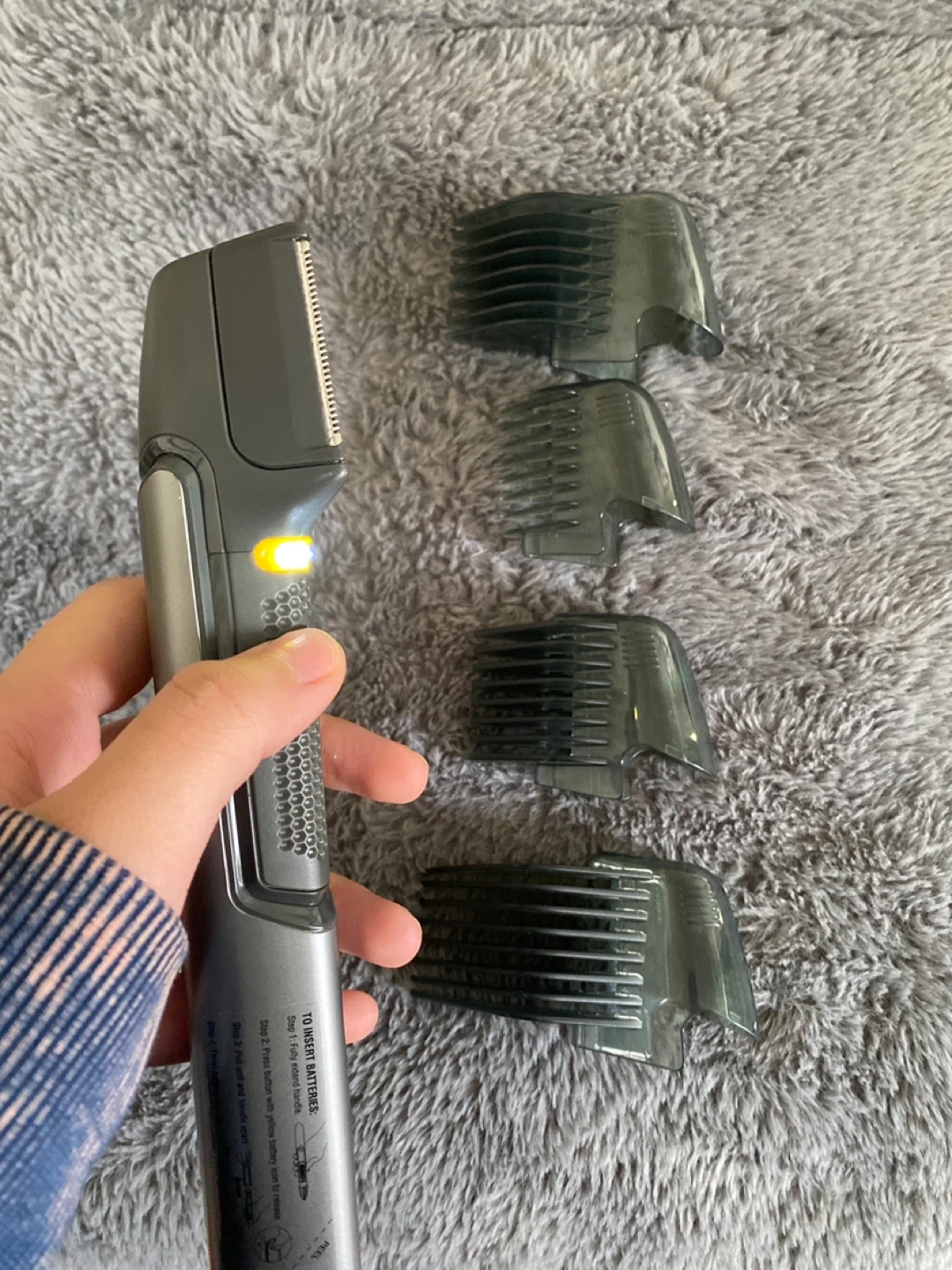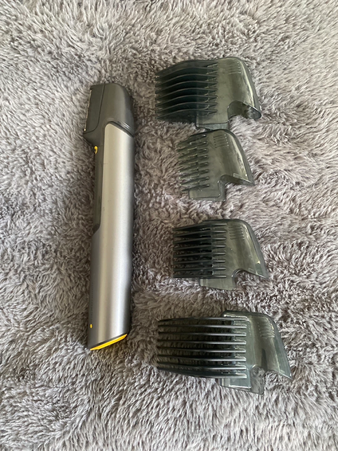 (OPEN TO OFFERS βοΈβοΈ) This is a Philips Norelco Multigroom trimmer. It comes with four different comb attachments for various lengths. The trimmer features a sleek grey and yellow design.