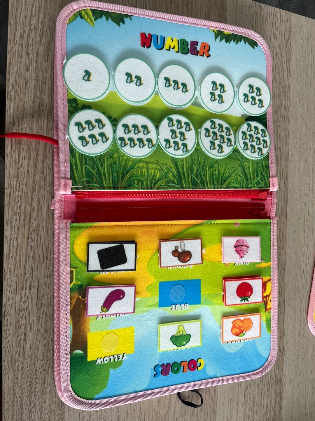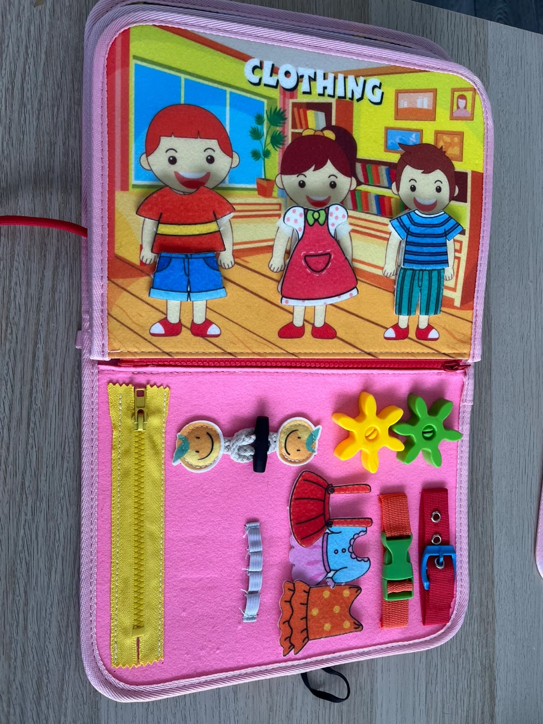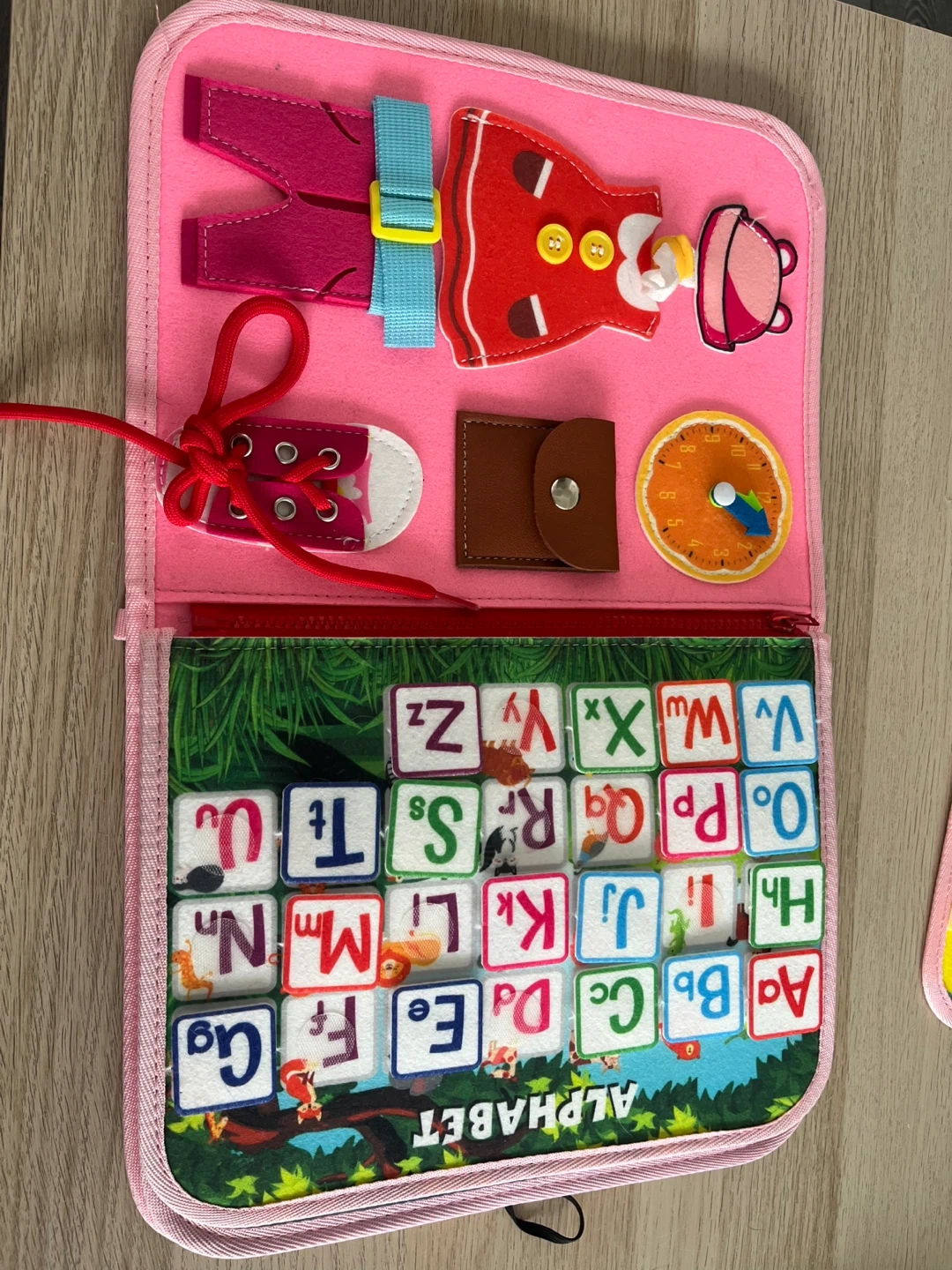 This soft busy book is filled with fun activities for little ones. It includes sections for numbers, colours, clothing, alphabet, shapes, and animals. It's great for developing fine motor skills and learning basic concepts. This toy is perfect for travel or quiet playtime! Is missing a few pieces (see pictures).