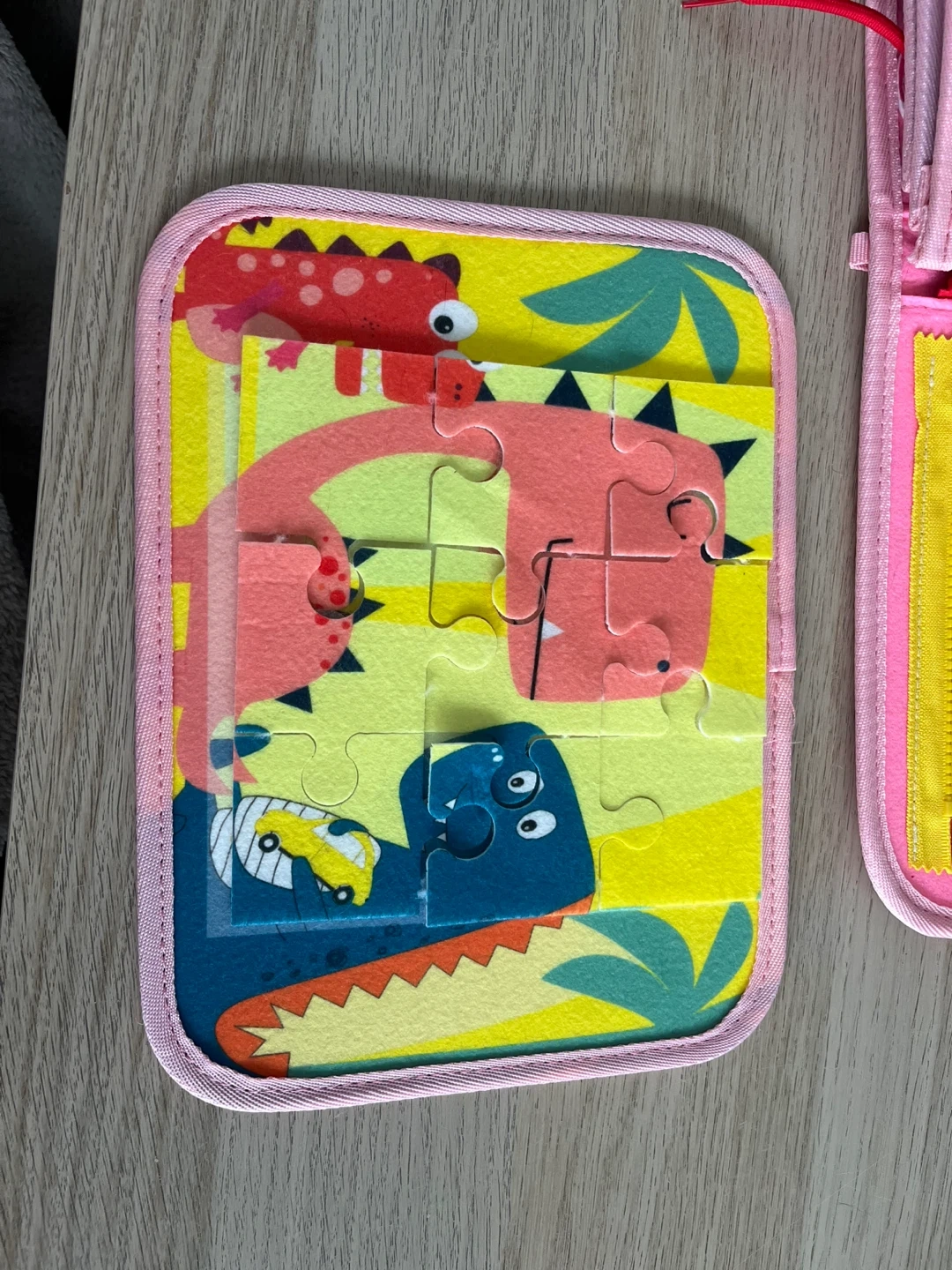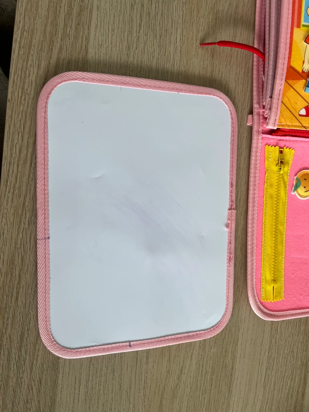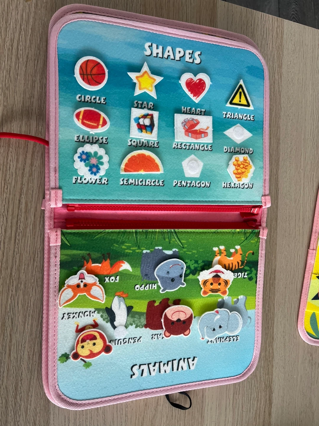 This soft busy book is filled with fun activities for little ones. It includes sections for numbers, colours, clothing, alphabet, shapes, and animals. It's great for developing fine motor skills and learning basic concepts. This toy is perfect for travel or quiet playtime! Is missing a few pieces (see pictures).