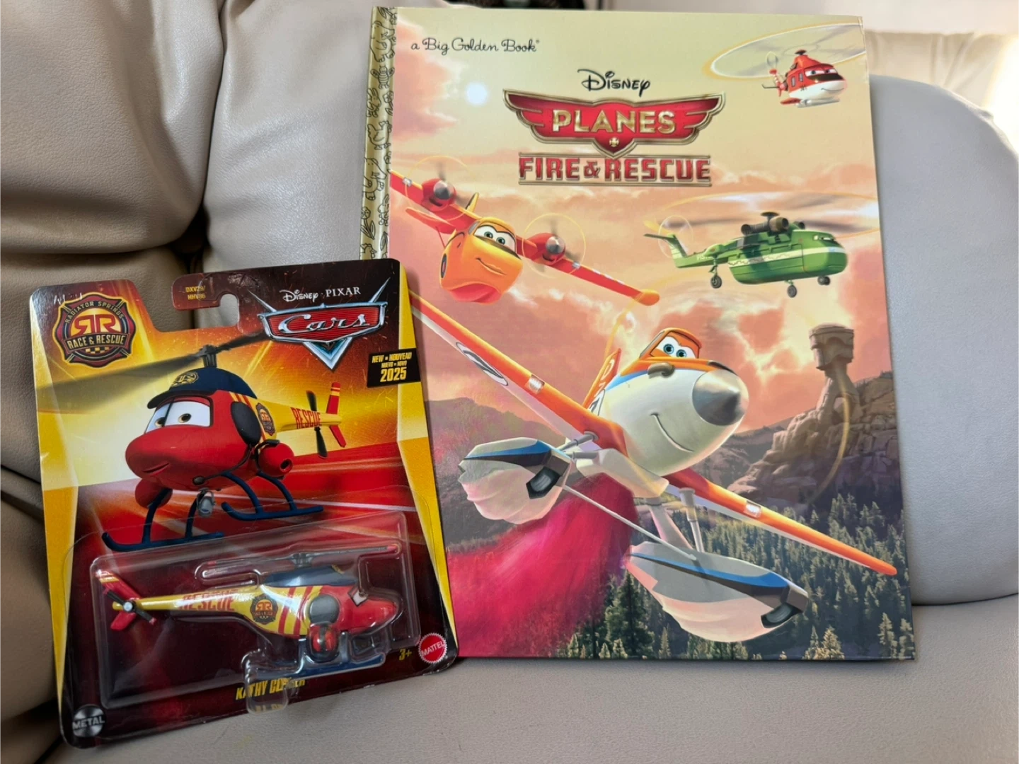 Selling a Disney Planes Fire & Rescue book, a Big Golden Book! Also included is a Disney Pixar Cars Radiator Springs Race & Rescue mattel Kathy Copter