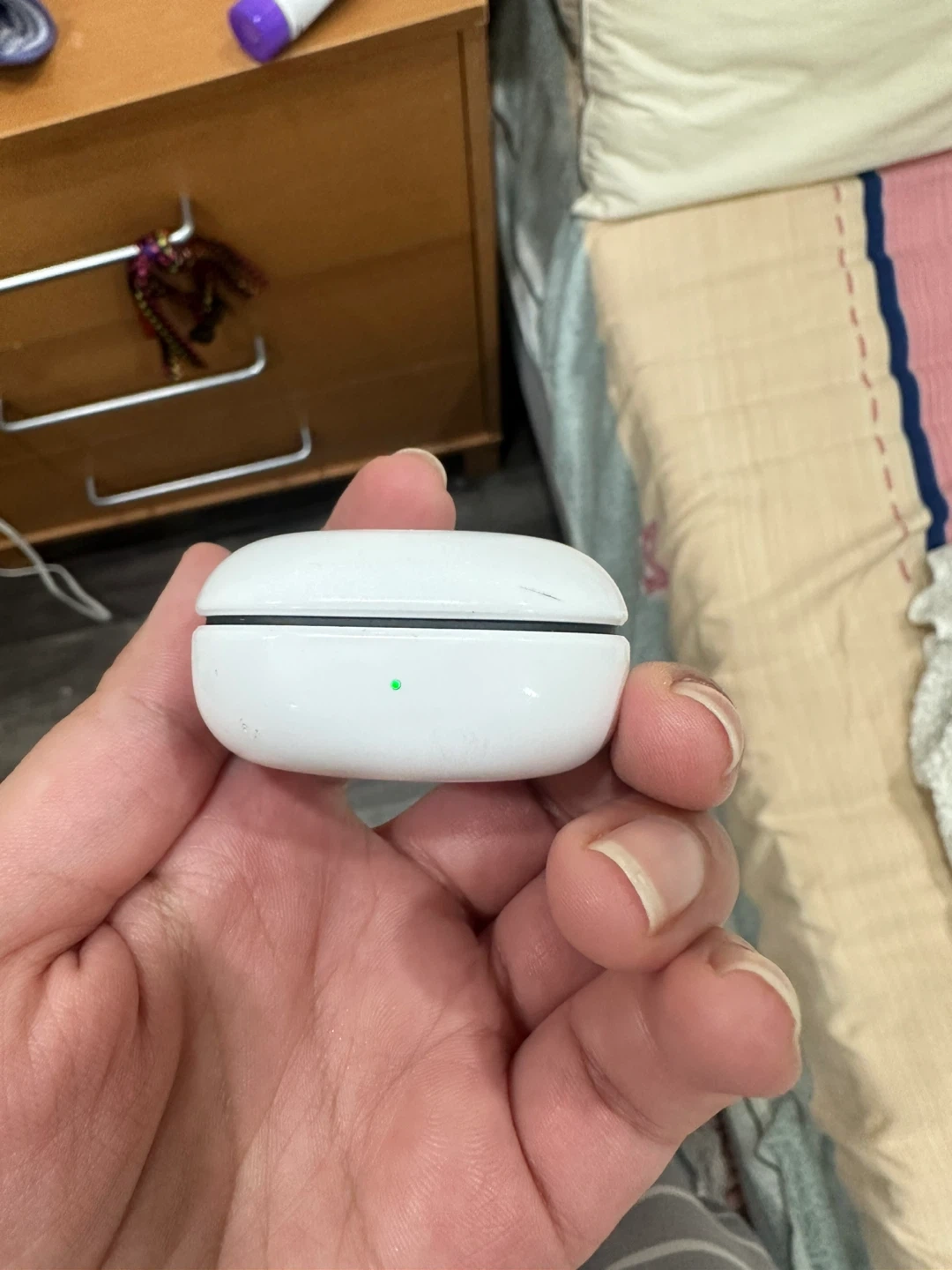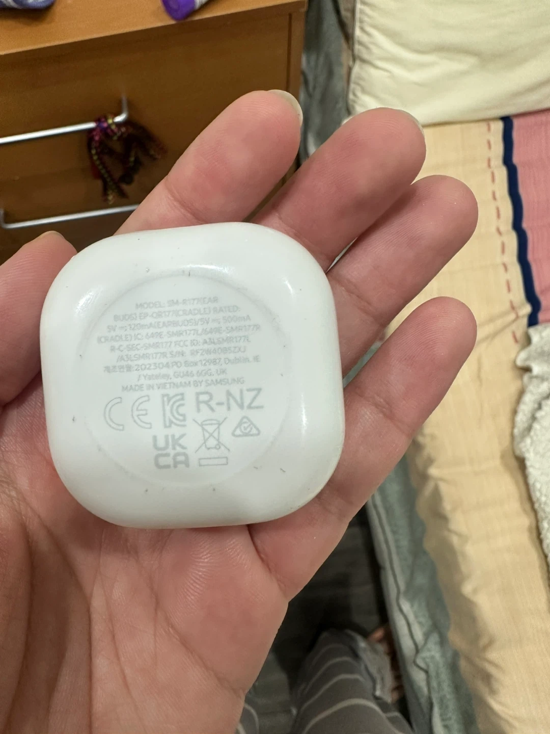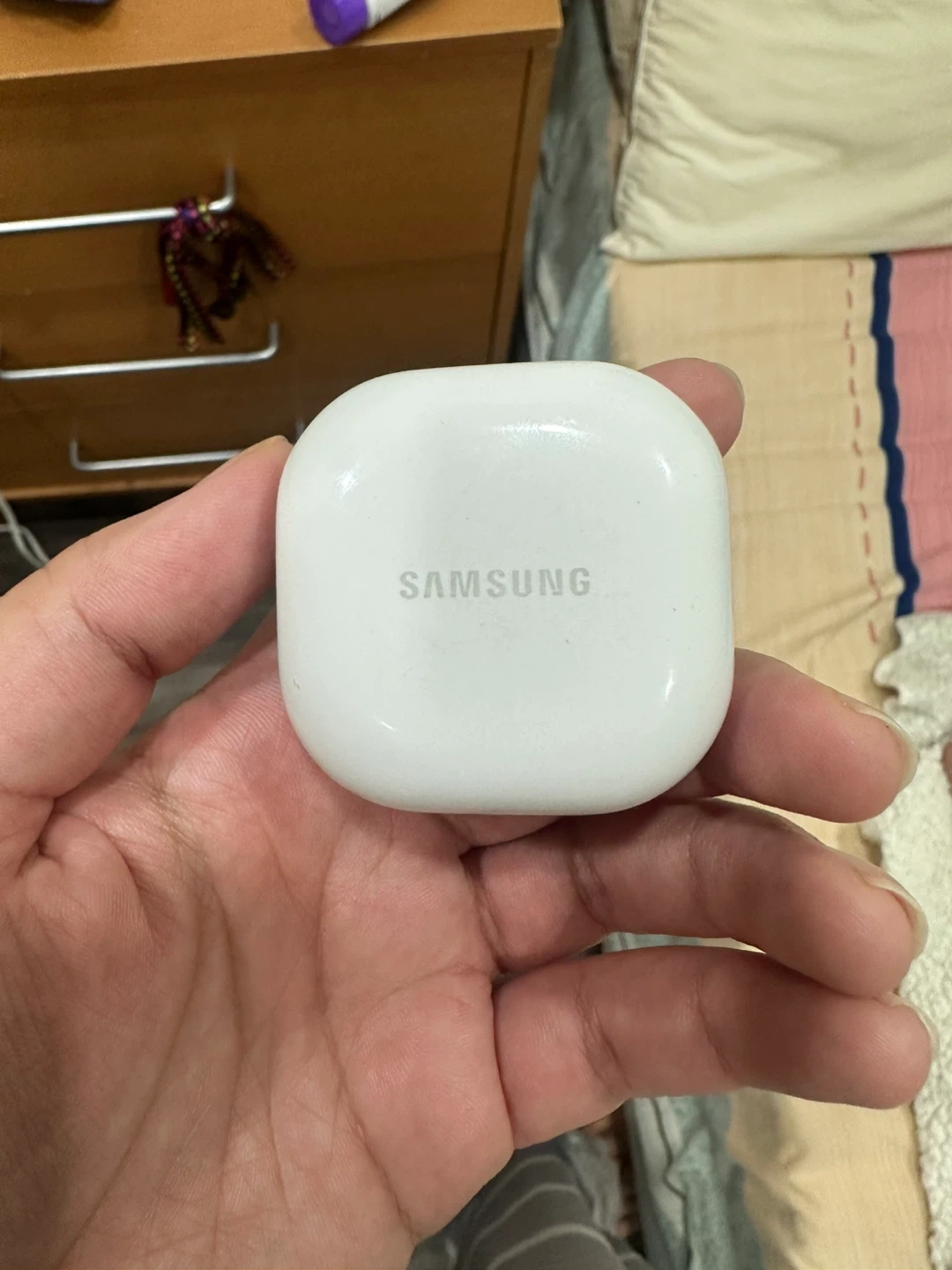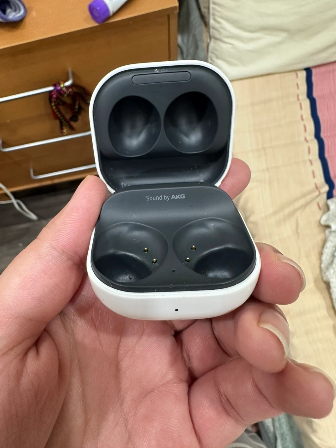 This is a white charging case for Samsung Galaxy Buds Pro. It's powered by AKG and features a USB-C charging port. The case is designed to charge your earbuds on the go.