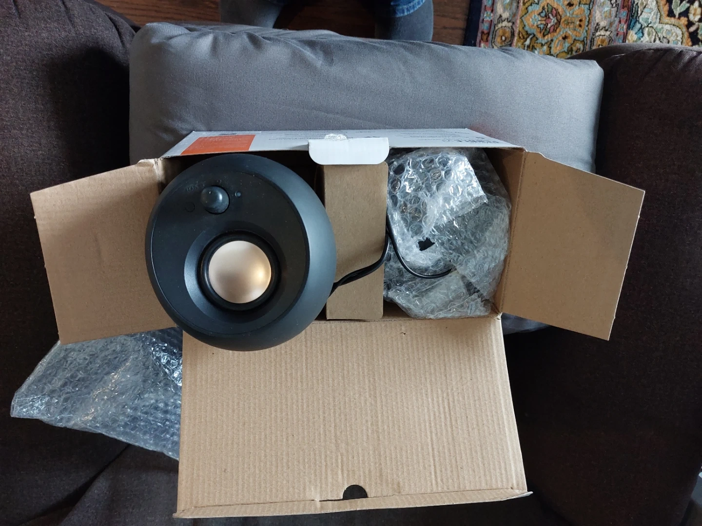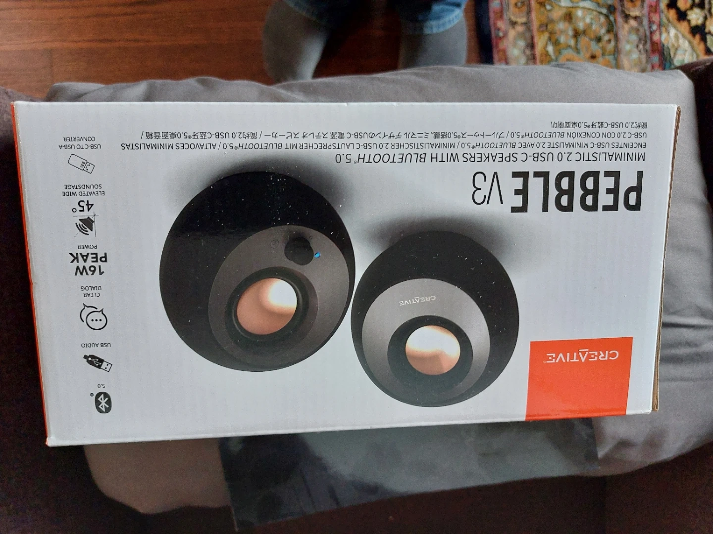 These are the Creative Pebble V3 speakers, featuring a minimalist design and USB-C connectivity. They support Bluetooth 5.0 for wireless audio. Includes original packaging and bubble wrap. 16W peak power.