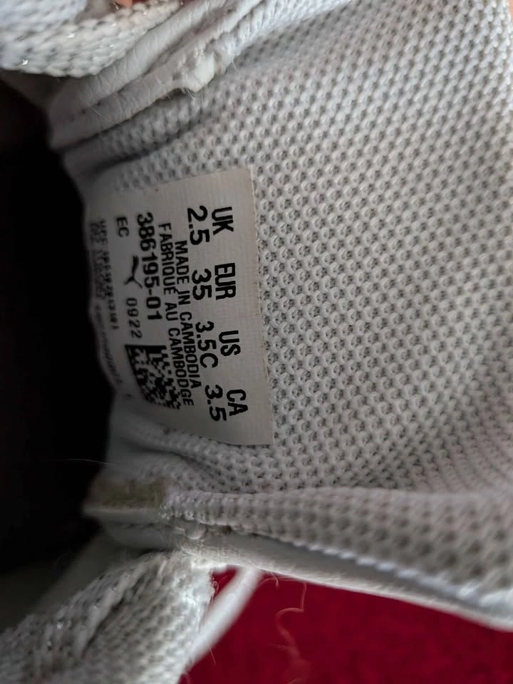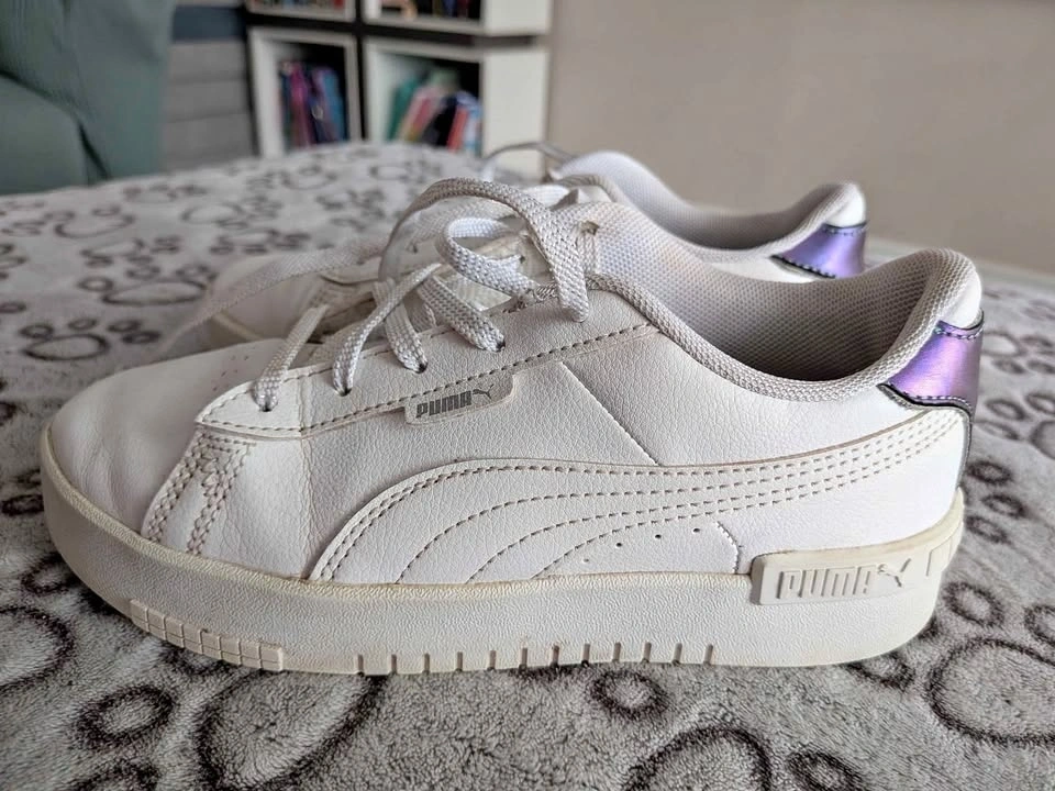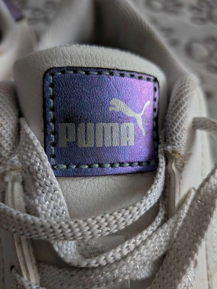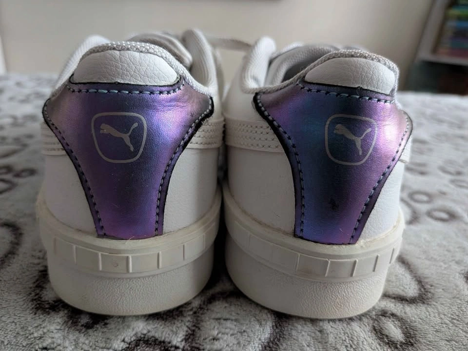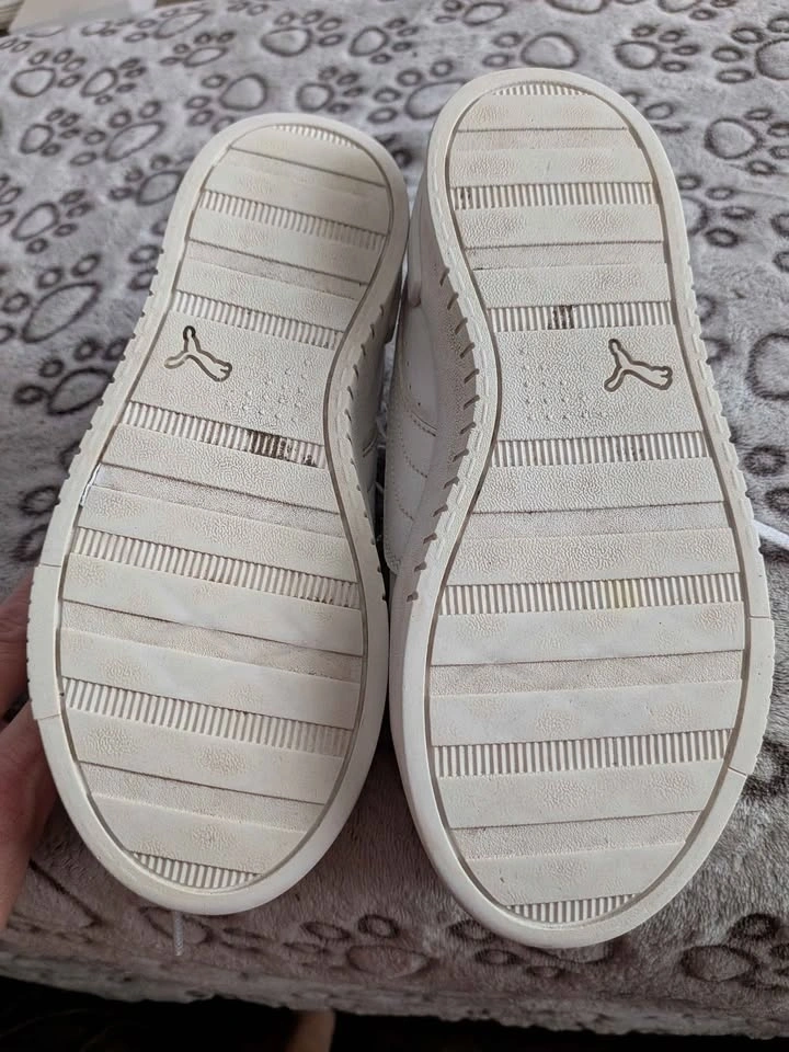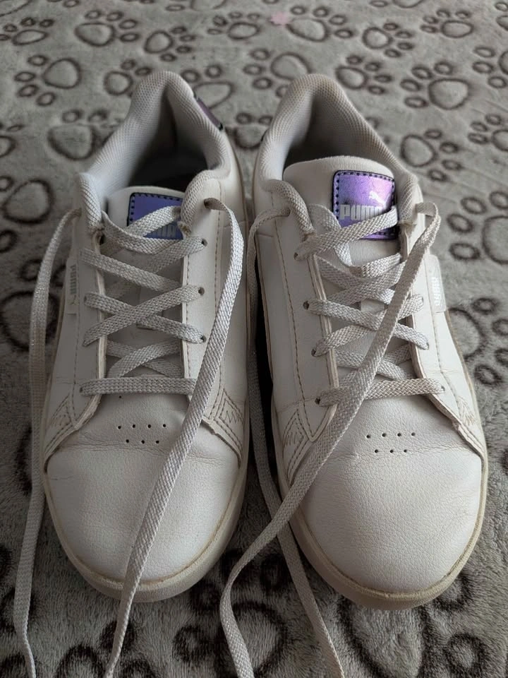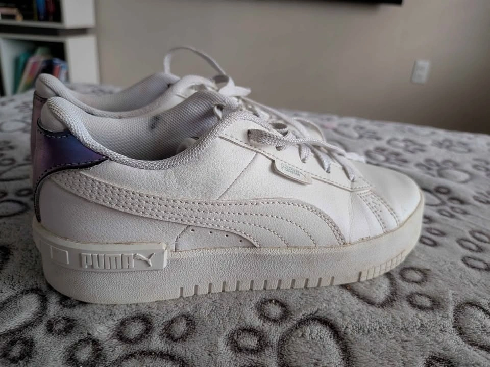 White Puma Shoes with purple details and original glittery laces. Only worn a few times. Size 3.5 - see photos. $25. Pickup is Appleby Line and Lakeshore area.