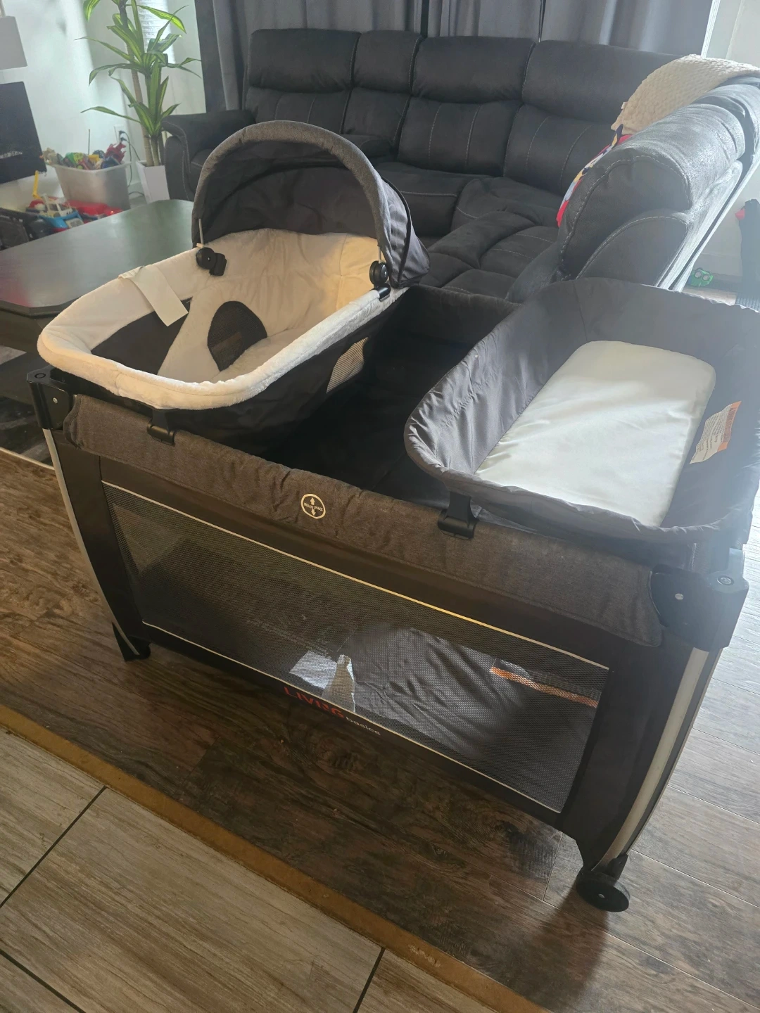 This LIVING basics 4-in-1 baby playard offers a removable bassinet and a changing table. It's foldable and designed for home travel or outdoor use. The playard includes multiple storage pockets for convenience.