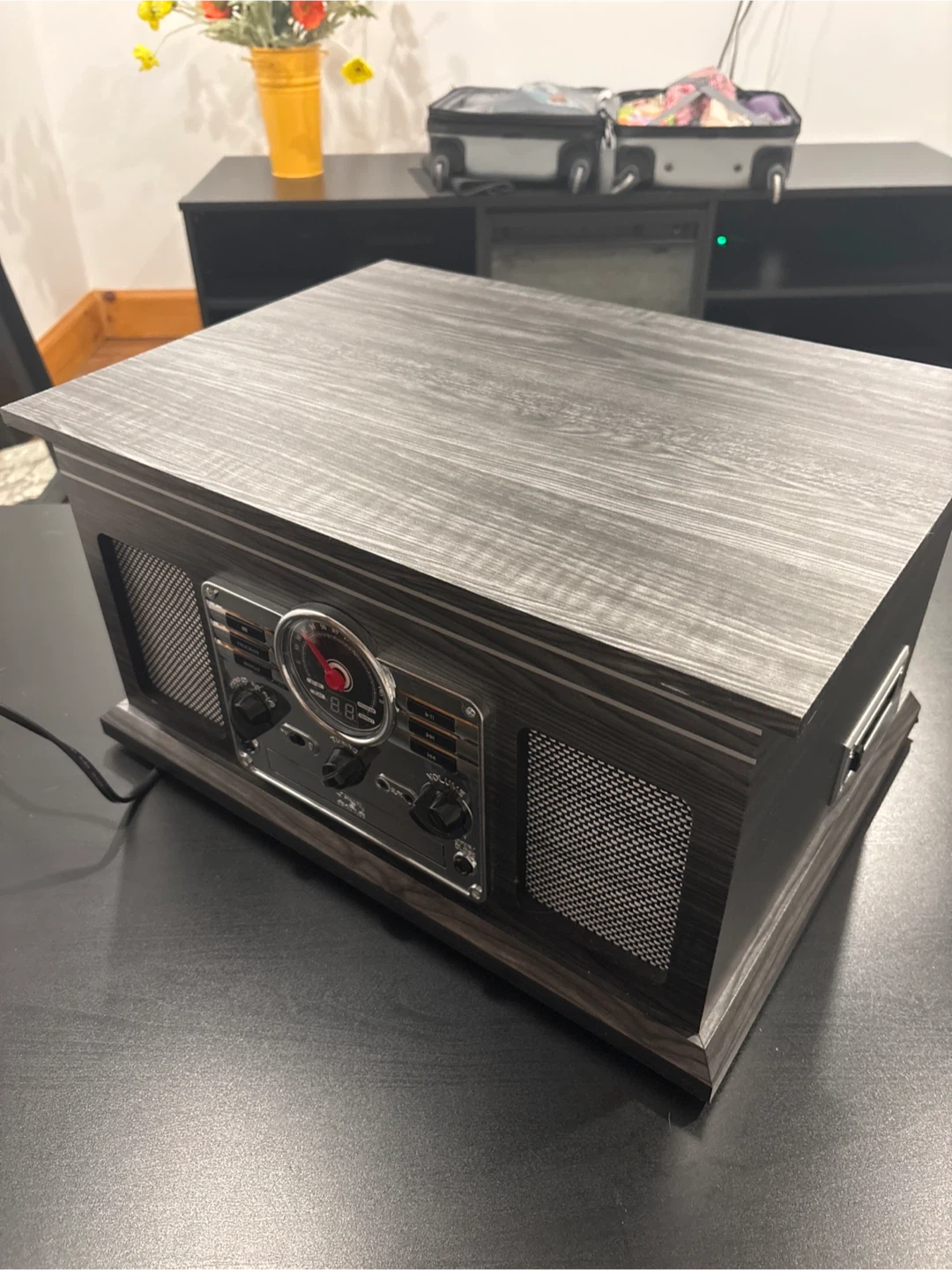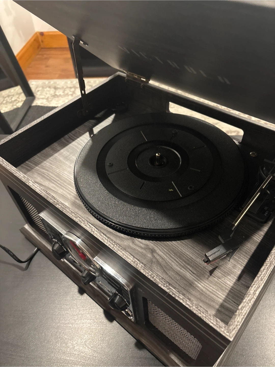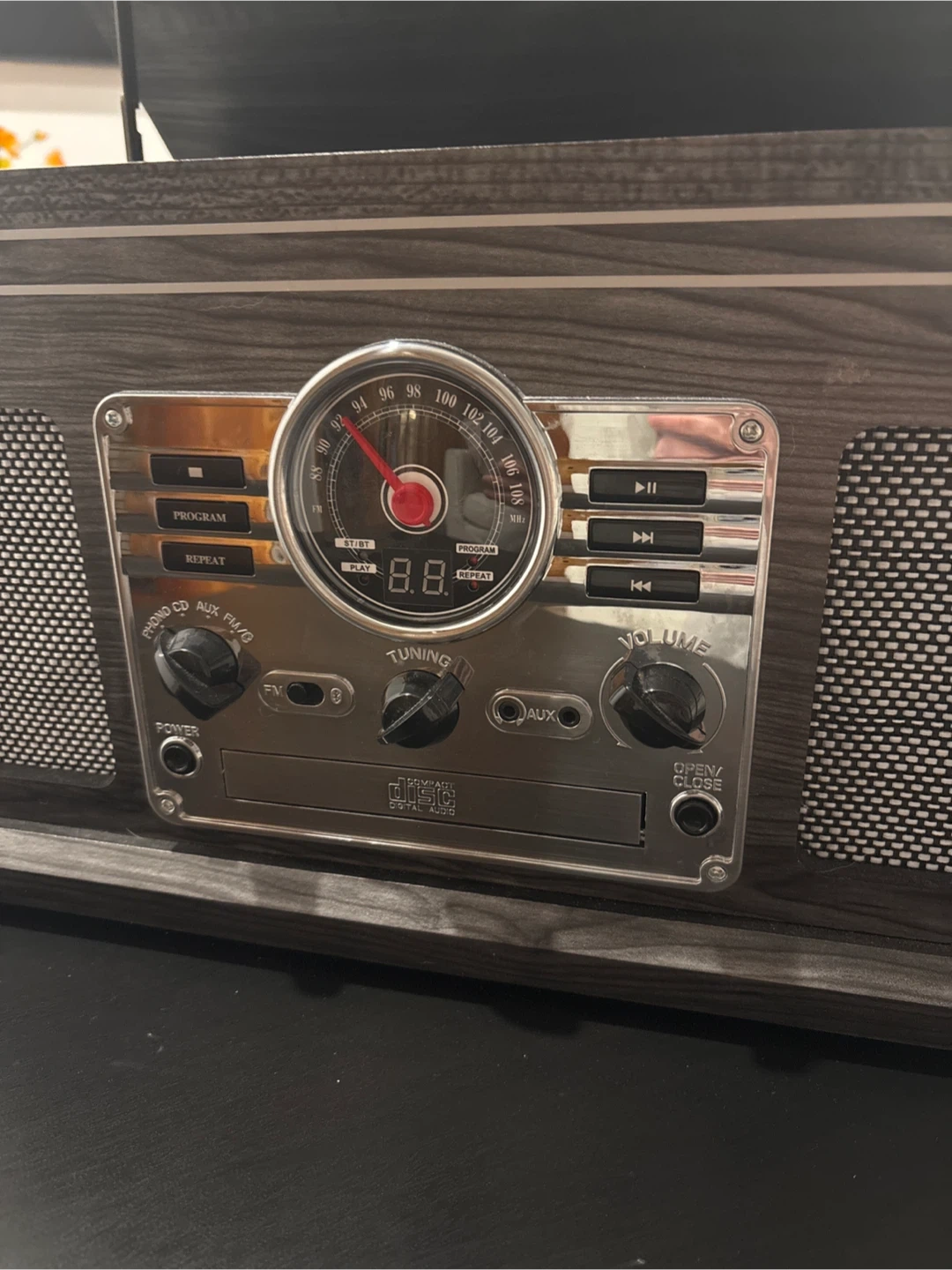 This Victrola record player features a 3-speed turntable for vinyl records. It also includes a CD player and AM/FM radio. It has auxiliary input for other devices.