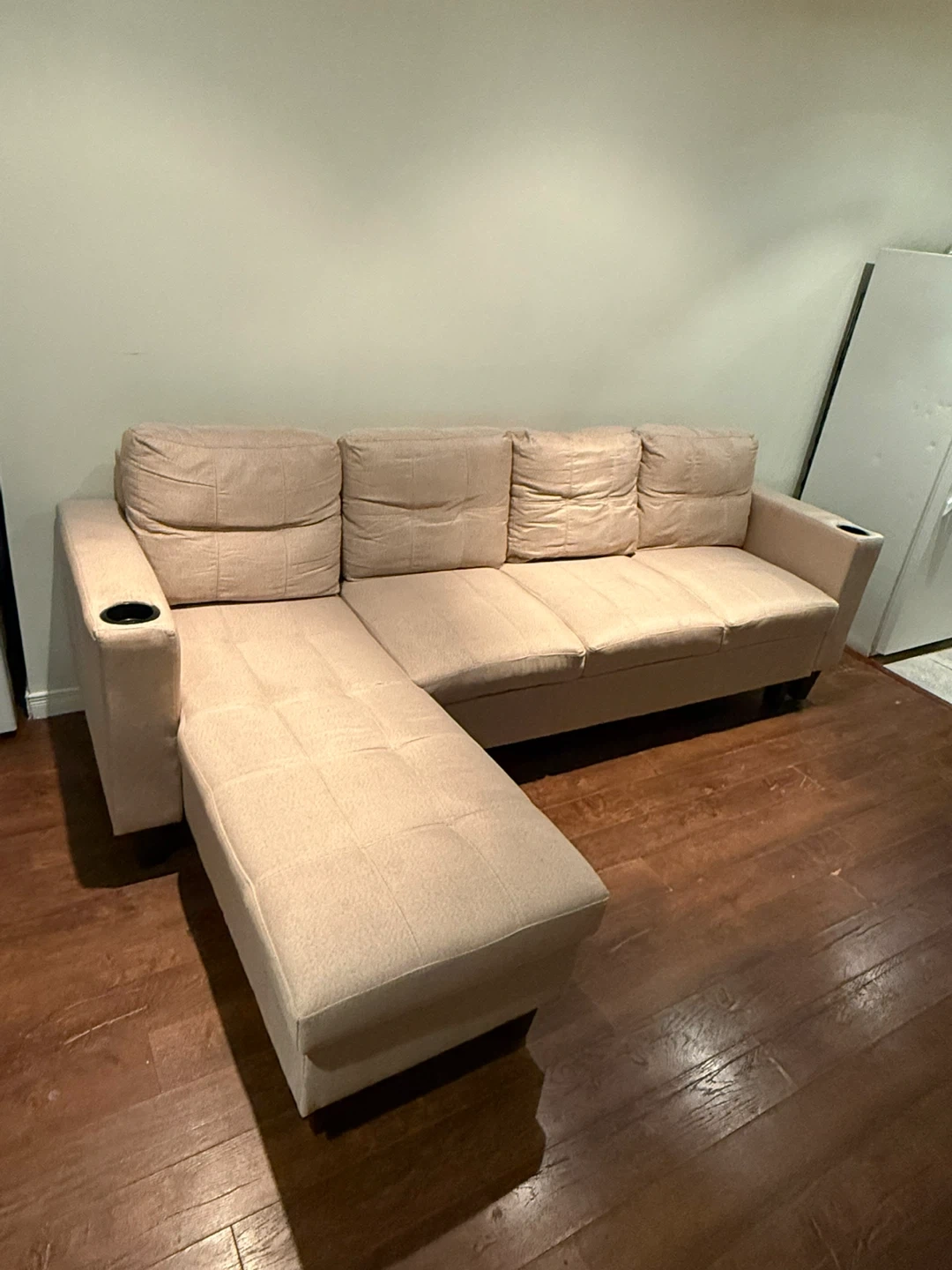 Comfortable and practical sectional sofa in a neutral beige colour that fits easily into most living spaces. Perfect for relaxing, hosting, or stretching out after a long day.